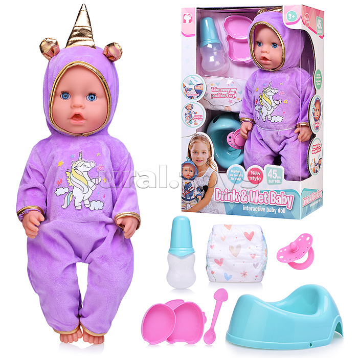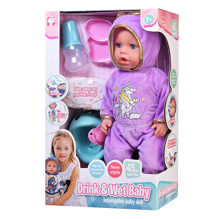 Код: 486374 Штрихкод: 6904111560597 Страна производитель: Китай Размеры упаковки: 43 x 27 x 13 см Количество в коробке: 12 • Высота пупса: 45 см. • Подвижные руки и ноги. • Глаза вставные, закрывающие. • Функции: - пьёт из бутылочки. - ходит на горшок. • Материал пупса: полимерные материалы, текстиль. • В комплекте: бутылочка, горшок, соска, памперс, тарелочка с ложечкой. • Соответствует требованиям безопасности продукции. • Для детей с 3-х лет. Комментарии к товару