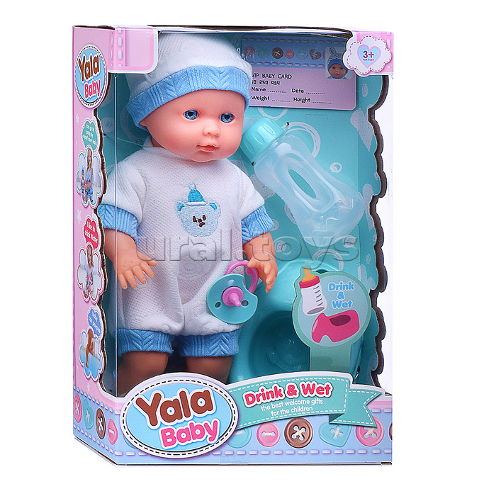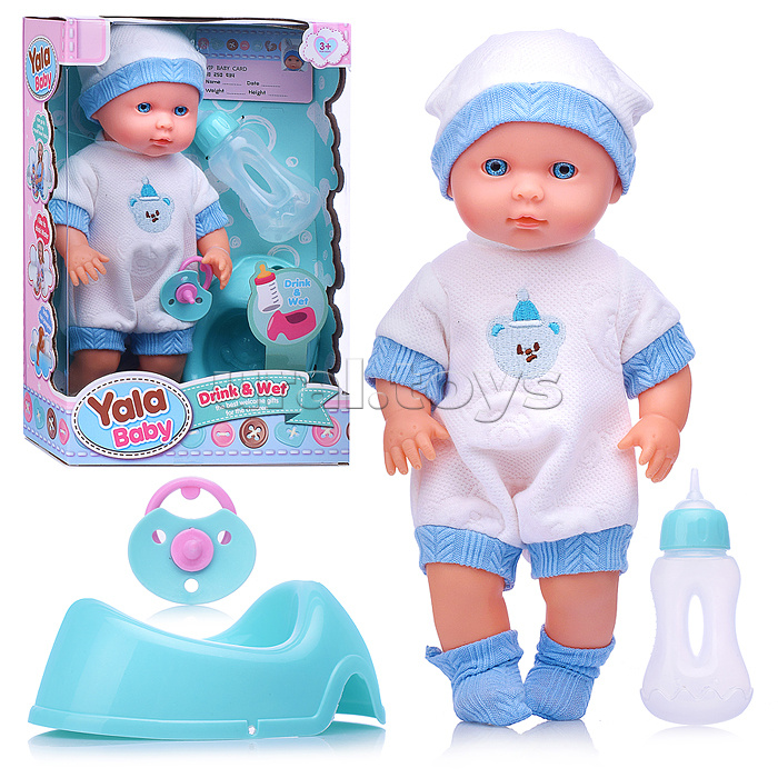Код: 486409 Штрихкод: 6904111559416 Страна производитель: Китай Размеры упаковки: 32 x 22 x 10 см Количество в коробке: 18 • Высота пупса: 30 см. • Подвижные руки и ноги. • Глаза вставные. • Функции: - пьёт из бутылочки. - ходит на горшок. • Материал пупса: полимерные материалы, текстиль. • В комплекте: бутылочка, соска, горшок. • Соответствует требованиям безопасности продукции. • Для детей с 3-х лет. Комментарии к товару