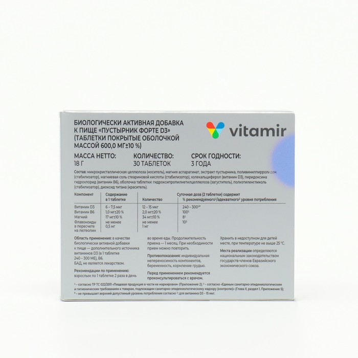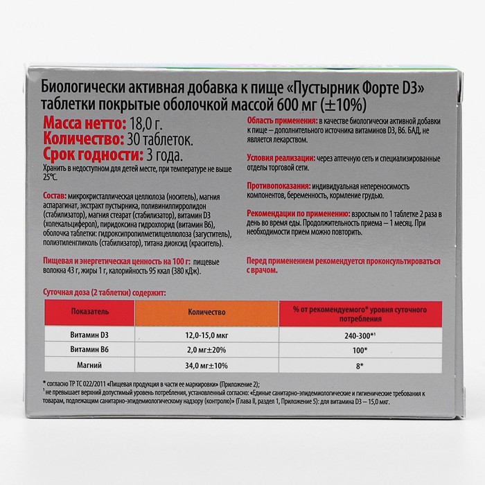 Габариты: 2 x 10 x 8 Страна: Россия В боксе: 60 шт Состав: См. на упаковке Материалы: см. на упаковке Фасовка: по 1 шт Индивидуальная упаковка: Цветная картонная коробка Сертификат: ЕАС В упаковке, шт.: 30 Назначение: Для сердца и сосудов, Для нервной системы Группа витаминов: Витамины D Форма выпуска: Таблетки Микроэлементы: Mg (магний) Показания: Повышенная нервная возбудимость, Стресс Компоненты: Пустырник Действие: Успокоительное Пустырник форте D3 благотворно влияет на нервную систему, а также способствует нормализации ритма сердца, снижению артериального давления, улучшению сна и эмоционального состояния. Экстракт пустырника снижает артериальное давление, обладает легким мочегонным действием, уменьшает сокращения матки, регулирует менструальный цикл, помогает при желудочно-кишечных расстройствах, применяется при метеоризме, спазмах желудка, снижает последствия простудных и инфекционных заболеваний. Способ применения и дозы: взрослым по 1 таблетке 2 раза в день во время еды. Продолжительность приема - 1 месяц. При необходимости прием можно повторить. Комментарии к товару