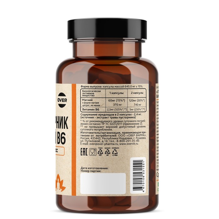 Показания: Рекомендуется в качестве биологически активной добавки к пище - ополнительного источника витамина В6, магния, содержащей иридоиды. Противопоказания: Индивидуальная непереносимость компонентов, беременность, кормление грудью. Перед применением рекомендуется проконсультироваться с врачом. Способ применения: Взрослым по 1 капсуле 2 раза в день во время еды. Продолжительность приема - 1 месяц. Специальные указания: Биологически активная добавка (БАД) к пище. Не является лекарственным средством. Условия хранения: Хранить в защищенном от прямых солнечных лучей и недоступном для детей месте при температуре не выше 25°С. Состав: Магния цитрат, желатиновая капсула (желатин, вода, краситель - диоксид титана), носитель - микрокристаллическая целлюлоза, экстракт травы пустырника, агенты антислеживающие: магниевая соль стеариновой кислоты, диоксид кремния аморфный; пиридоксина гидрохлорид (Витамин В6). 2 капсулы (суточная дозировка) содержат: магний - 120 мг, в форме магний цитрат - не менее 740 мг; Витамин В6 - 5 мг; иридоиды - 2,4 мг. Срок годности: 3 года. Комментарии к товару