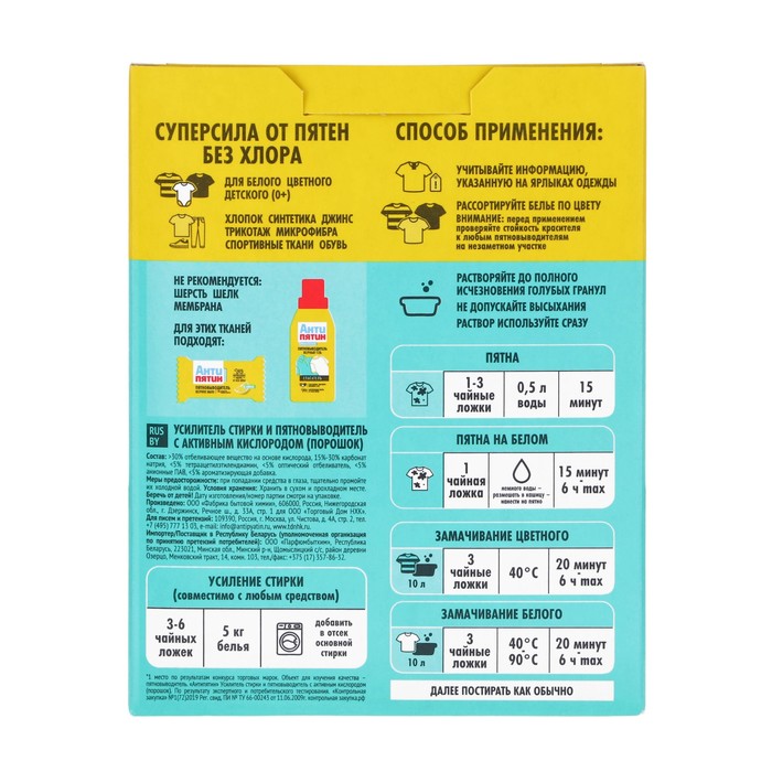 Габариты: 13,5 x 10,5 x 4 Страна: Россия В боксе: 28 шт Состав: См. на упаковке Материалы: см. на упаковке Фасовка: по 1 шт Индивидуальная упаковка: Цветная картонная коробка Сертификат: Не подлежит сертификации Вес, г/Объём, мл: 300 Ароматизированные: Нет Форма выпуска: Порошок Назначение: Для всех видов тканей, Для цветных тканей, Для белых тканей, Для детского белья Темпер. ограничение НЕ НИЖЕ ℃: 0 Вид средства: Пятновыводитель Антибактериальное: Нет Вес/Объём: 300 г OXI формула. За счет высокого содержания активного кислорода удаляет трудновыводимые пятна и обеспечивает ослепительную белизну. Наличие в гранулах TAED компонента, необходимого для активизации кислорода при низких температурах, обеспечивает эффективное действие уже при температуре 40 °С. OXI формула. За счет высокого содержания активного кислорода удаляет трудновыводимые пятна и обеспечивает ослепительную белизну. Наличие в гранулах TAED компонента, необходимого для активизации кислорода при низких температурах, обеспечивает эффективное действие уже при температуре 40 °С. Удаляет трудновыводимые свежие и застарелые пятна кофе, чая, сока, чернил и т. д. Может использоваться для выведения локальных пятен, при замачивании, а также в качестве усилителя стирального порошка. Состав: 30% отбеливающее вещество на основе кислорода, 15%-30% карбонат натрия, <5% тетраацетилэтилендиамин, <5% оптический отбеливатель, <5% анионные ПАВ, <5% ароматизирующая добавка. Комментарии к товару