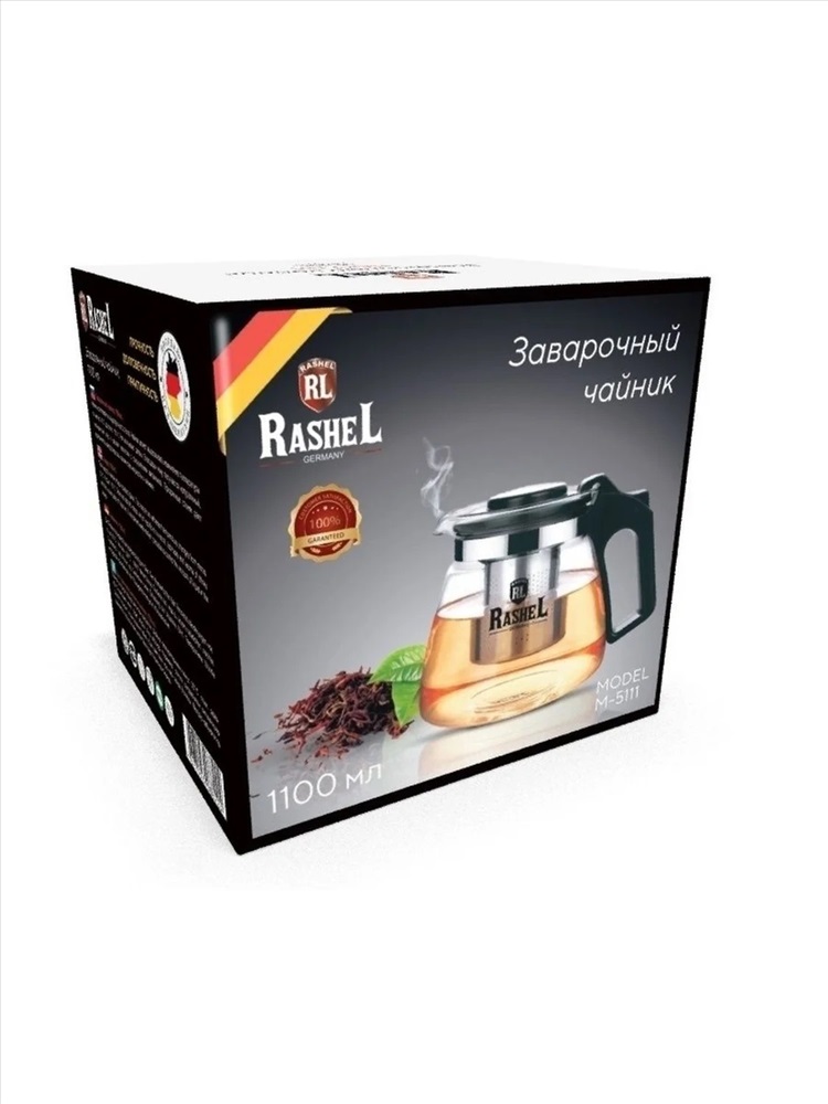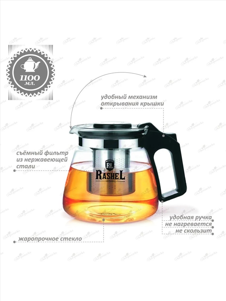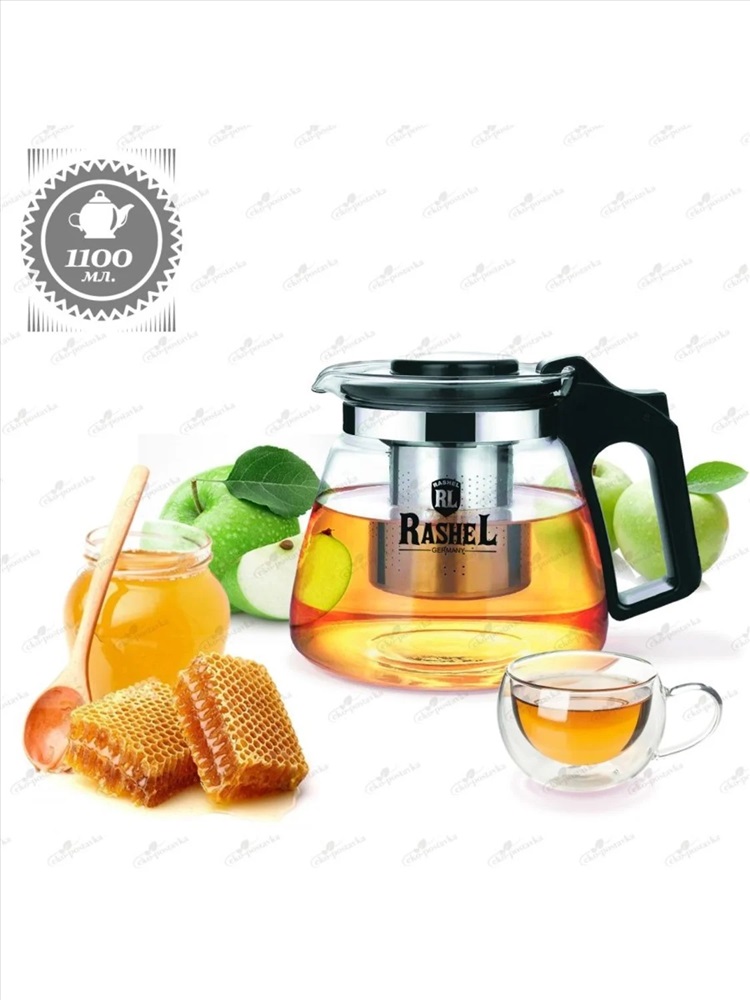 Заварочный чайник 1,1 литра изготовлен из жаропрочного стекла.