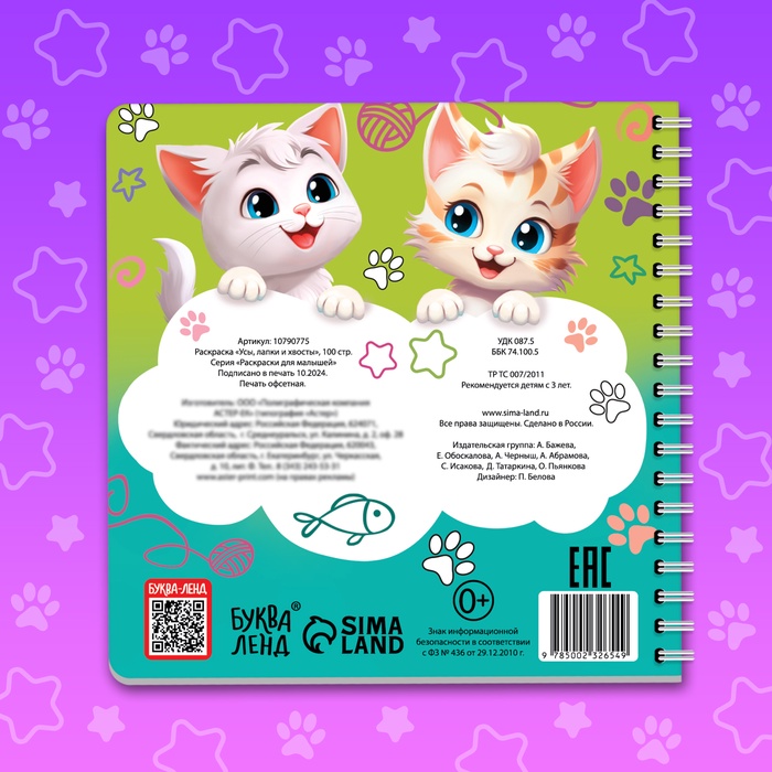 Габариты: 20 x 1 x 19 Страна: Россия В боксе: 75 шт Состав: Бумага, металл Материалы: бумага, металл Фасовка: по 1 шт Индивидуальная упаковка: Пакет Сертификат: ЕАС Набор: Нет Для кого: Унисекс Формат: Квадрат Возраст: От 3 лет Количество страниц: 104 Возраст: Детский Вид раскраски: Классические Тип обложки: Интегральный переплёт Изображение: Животные Комплектация набора: Без комплектации Раскраска для малышей «Усы, лапки и хвосты» — познакомит кроху с прекрасными котятами и их друзьями. Особенности раскраски