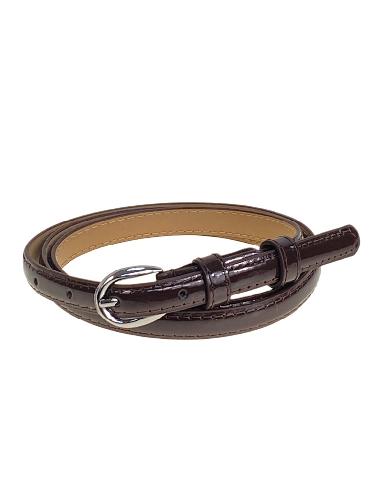Женский ремень из лакированной искусственной кожи. Пряжка металлическая, округлой формы, игольчатая. Цвет фурнитуры никель. Ремень оснащён двумя фиксаторами.