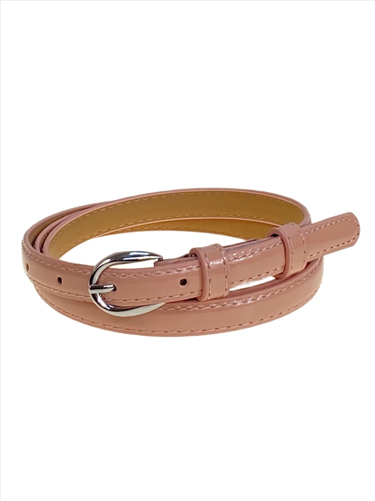 Женский ремень из лакированной искусственной кожи. Пряжка металлическая, округлой формы, игольчатая. Цвет фурнитуры никель. Ремень оснащён двумя фиксаторами.