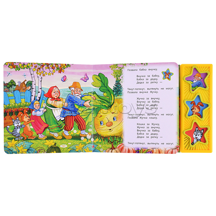 - 3 звуковые кнопки в виде звёздочек - 3 песни по мотивам сказки - красочные иллюстрации - любимая сказка - кнопка Вкл./Выкл. на обороте Работает от 3-х батареек типа LR44 (в комплекте)