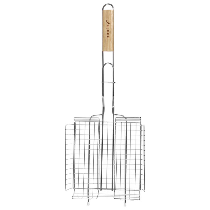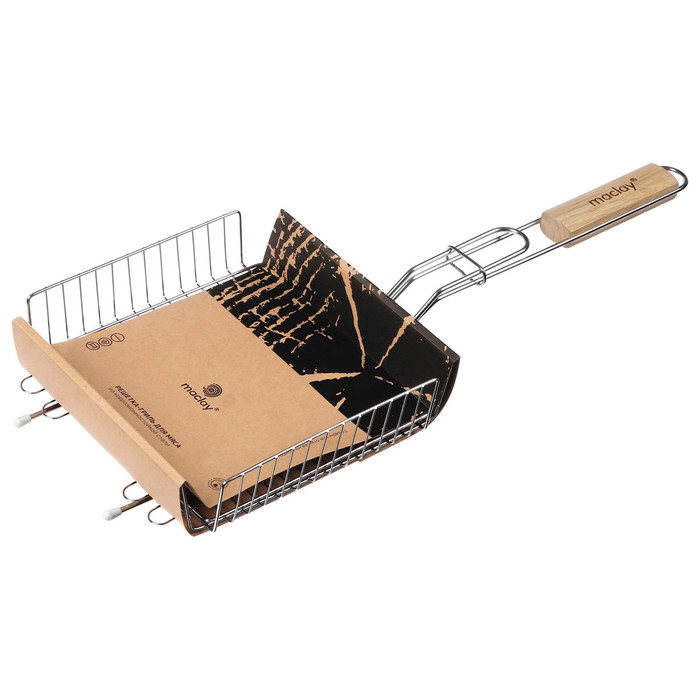 Габариты: 56 x 22,5 x 5,5 Страна: Китай В боксе: 24 шт Состав: Дерево, нержавеющая сталь Материалы: дерево, нержавеющая сталь Фасовка: по 1 шт Индивидуальная упаковка: Без упаковки Сертификат: Не подлежит сертификации Размер, см: 20 х 20 Материал ручки: Дерево Материал рабочей части: Нержавеющая сталь Назначение: Универсальная Антипригарное покрытие: Нет Фиксированная цена: Да Решётка-гриль Maclay предназначена для приготовления мяса, овощей и рыбы на мангале. Изделие имеет углублённую рабочую поверхность. Особенности