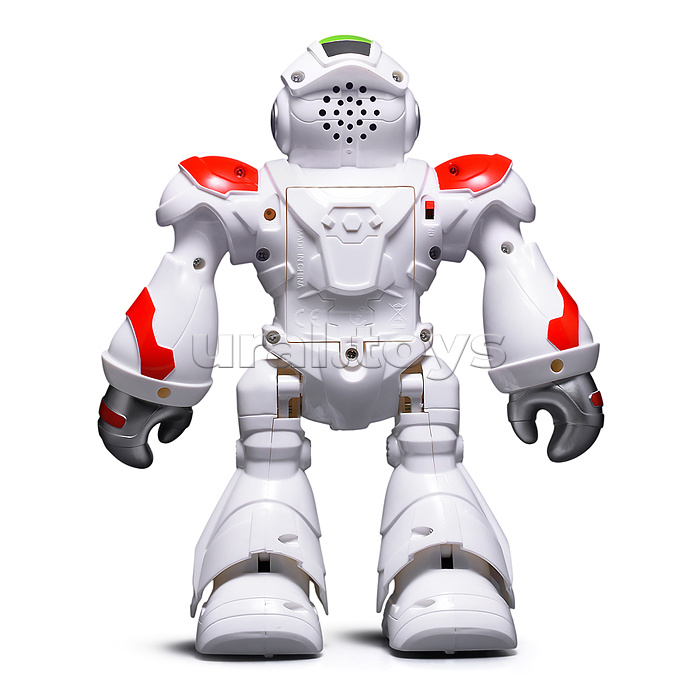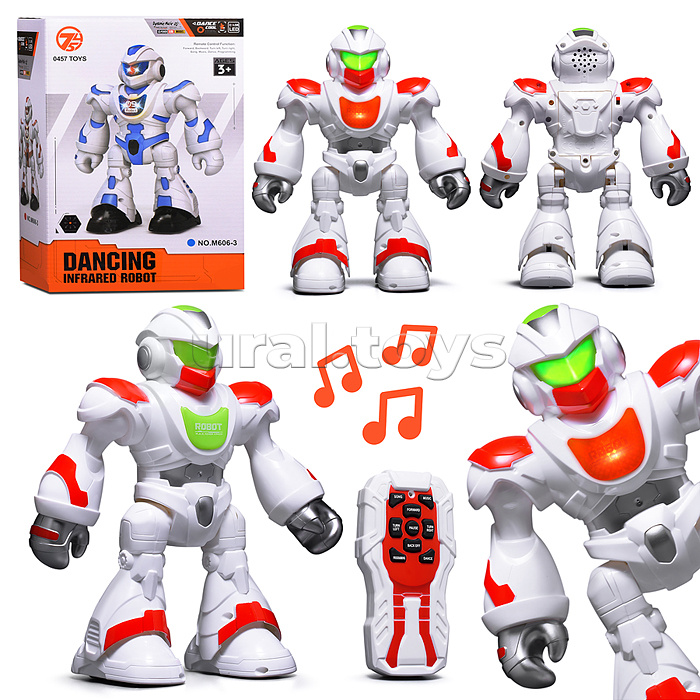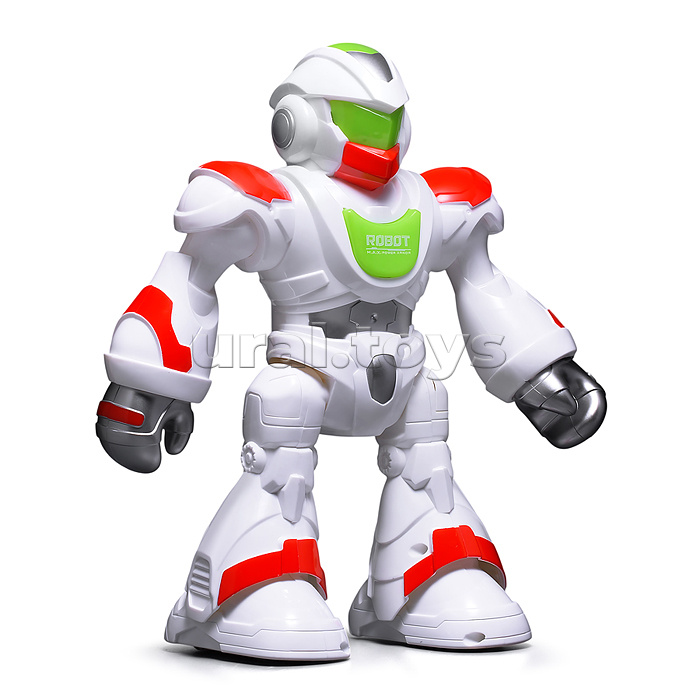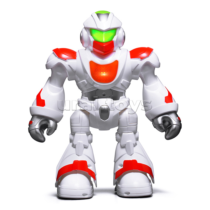 • Робот работает от 3-х батареек "АА" (не входят в комплект). • Пульт управления работает от 2-х батареек "АА" (не входят в комплект) • Функции: - движение вперёд, назад, влево, вправо. - танец под музыку. - мелодии. - подсветка шлема. - программирование действий. • Размеры робота: 19х9х24 см. • Материал: пластик. • Соответствует требованиям безопасности продукции. • Для детей от 3-х лет.