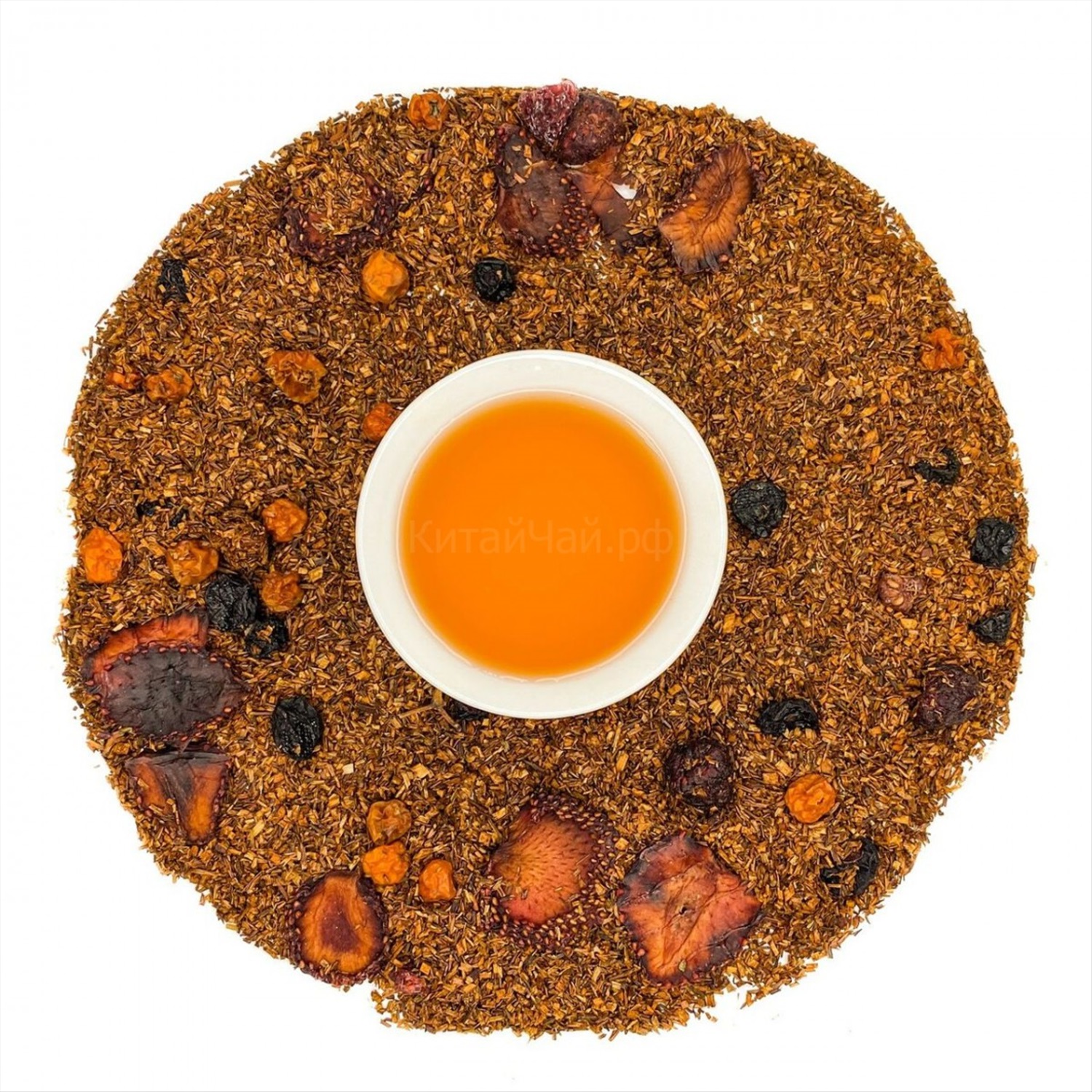Ройбос, малина, кусочки клубники, рябина, смородина. Ароматизирован натуральными маслами. Чайный напиток с ярким вкусом спелых лесных ягод.