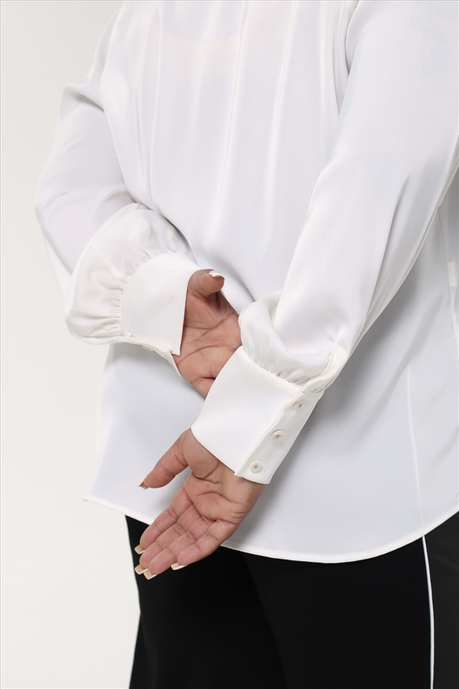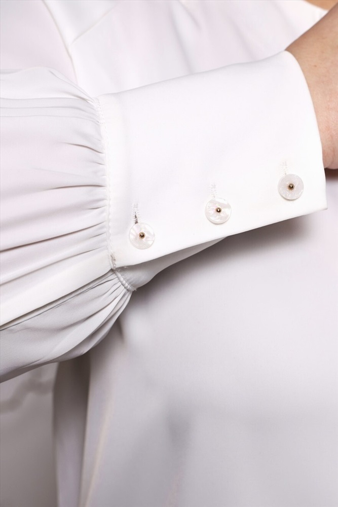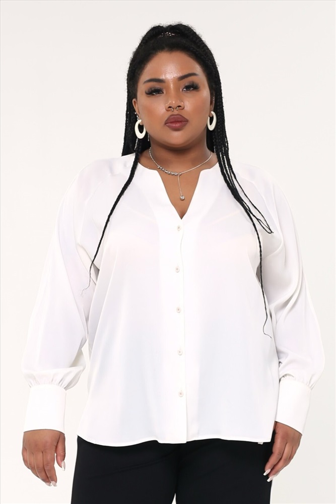 Лаконичная рубашка прямого кроя из мягкого струящегося материала - идеальный вариант для женщин, ценящих простоту и элегантность. Модель привлекает оригинальным дизайном. V-образный вырез переходит в оригинальную планку. Рубашка застегивается спереди на изящные пуговки. Свободные рукава полной длины оформлены по низу широкими манжетами, которые застегиваются на пуговки. Небольшие разрезы по бокам обеспечивают оптимальную посадку по фигуре. Свободный крой искусно обыгрывает силуэт, а мягкий, приятный телу материал подарит комфорт на весь день. Отлично подходит для комбинирования с брюками и юбками.