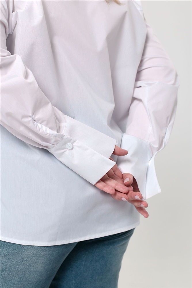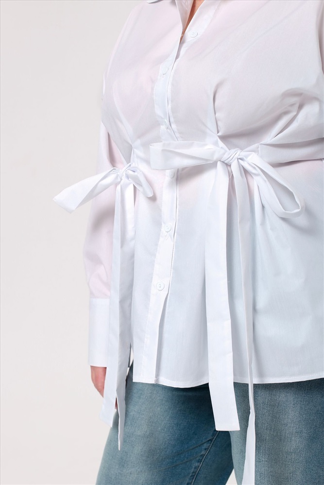 Удлиненная рубашка из мягкого материала. Модель прямого кроя имеет классический отложной воротник. Застегивается спереди на пуговицы под планку по всей длине. Приспущенные рукава полной длины по низу оформлены широкими манжетами. С помощью оригинальных завязок по переду можно обозначить талию. Полуприлегающий силуэт не сковывает движений и искусно обыгрывает фигуру, маскируя мелкие недостатки. Отлично подходит для комбинирования с брюками и легинсами.