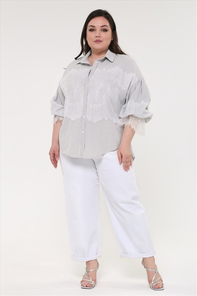 Оригинальная рубашка прямого кроя из мягкого материала. Круглый вырез дополнен классическим отложным воротником. Рукава полной длины с приспущенной проймой по низу присобраны на тонкие резиночки. Модель застёгивается на оригинальные пуговки под планку. Актуальный полосатый принт добавляет динамичности, нежное кружево по переду и на рукавах добавляет модели особой женственности. Удлиненная спинка и небольшие разрезы по бокам не сковывают движений и искусно обыгрывают фигуру, маскируя мелкие недостатки. Рубашка отлично сочетается как с брюками, так и с леггинсами.