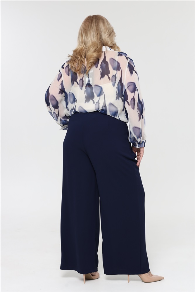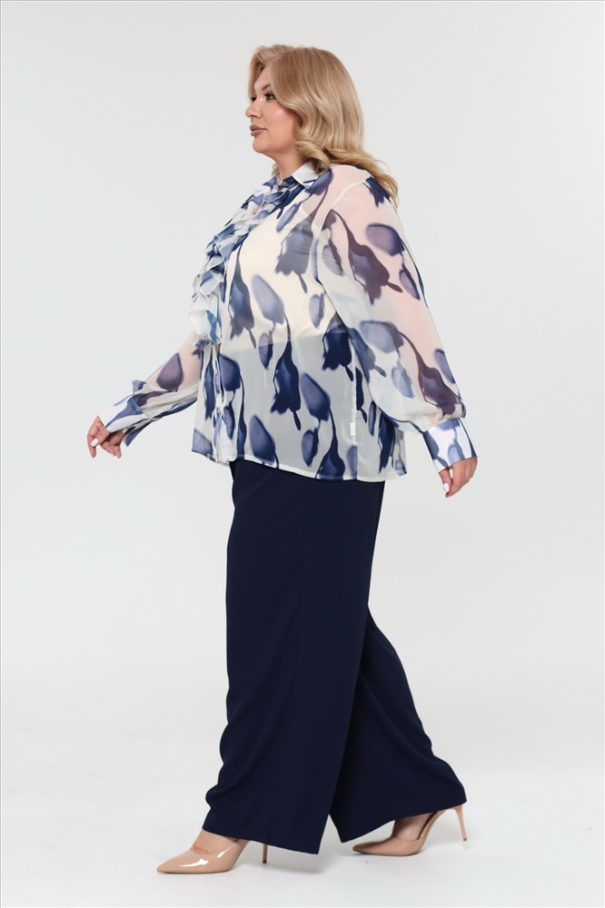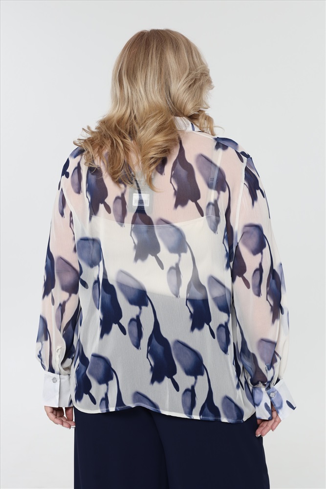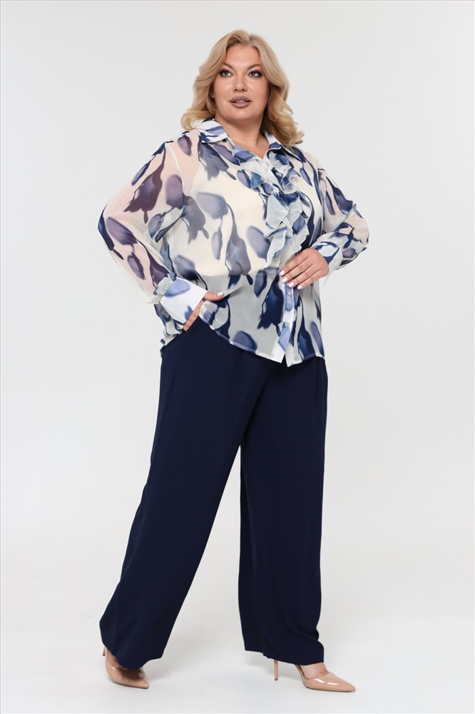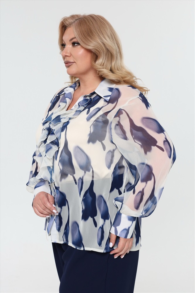 Комплект состоит из рубашки и топа. Рубашка прямого кроя выполнена из мягкого шифона. Модель привлекает внимание оригинальным дизайном. Рубашка застегивается спереди по всей длине на пуговицы под планку. Имеет классический отложной воротник и рукава полной длины на широких манжетах по низу. Кокетливый волан по планке добавляет модели женственности, а растительный принт - динамичности.