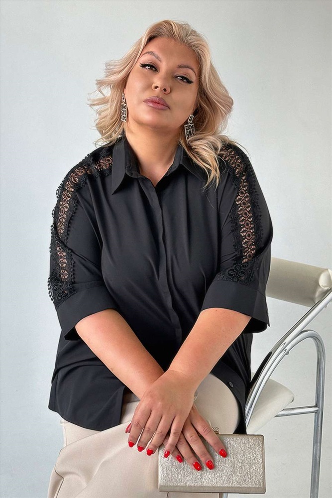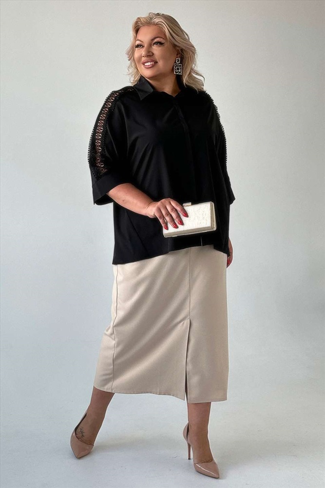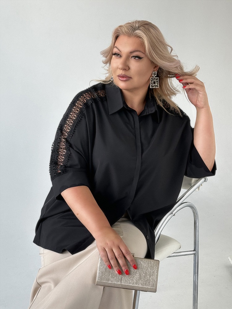 Удлиненная рубашка прямого кроя идеальный вариант для женщин, ценящих простоту и элегантность. Модель привлекает внимание оригинальным дизайном. Застегивается спереди на пуговицы под планку. Имеет классический отложной воротник. Цельнокроеные рукава длиной 3/4 сверху декорированы оригинальным кружевом, что добавляет модели женственности и нарядности. Модные надписи на груди освежают образ и добавляют динамичности. Удлиненная спинка способствует оптимальной посадке по фигуре. Мягкий материал подарит комфорт на весь день. Рубашку можно комбинировать как с узкими брюками, так и с легинсами.