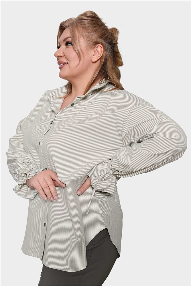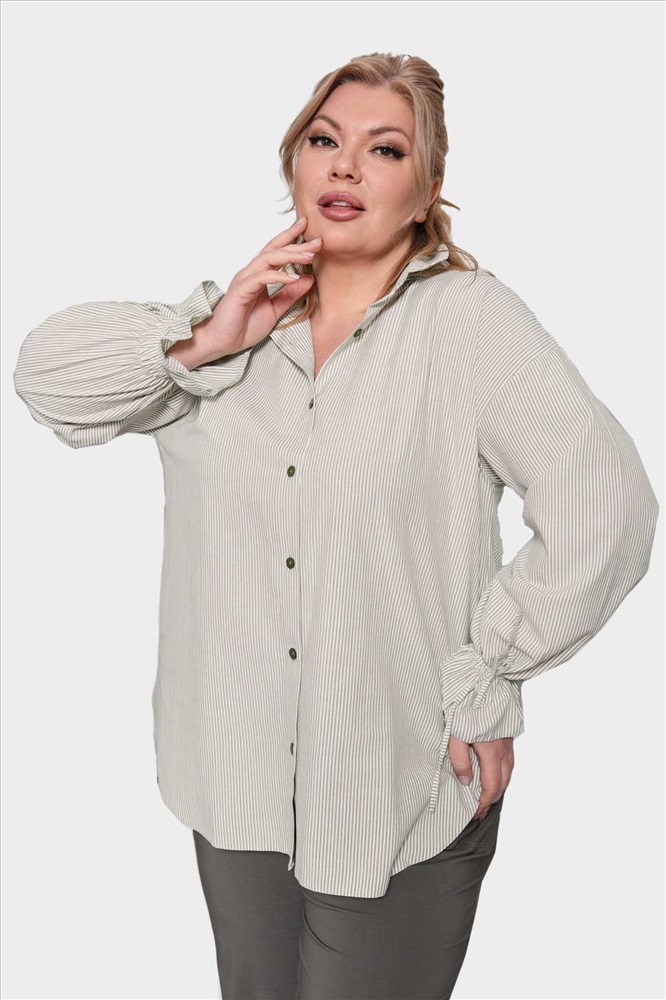 Оригинальная рубашка прямого кроя из мягкого материала. Круглый вырез дополнен классическим отложным воротником. Рукава полной длины с приспущенной проймой по низу присобраны на тонкие резиночки и дополнены оригинальными завязками, которыми можно регулировать объем манжеты. Модель застёгивается на оригинальные пуговки под планку. Актуальный полосатый принт добавляет динамичности. Удлиненная спинка и закругленные бока не сковывают движений и искусно обыгрывают фигуру, маскируя мелкие недостатки. Рубашка отлично сочетается как с брюками, так и с легинсами.