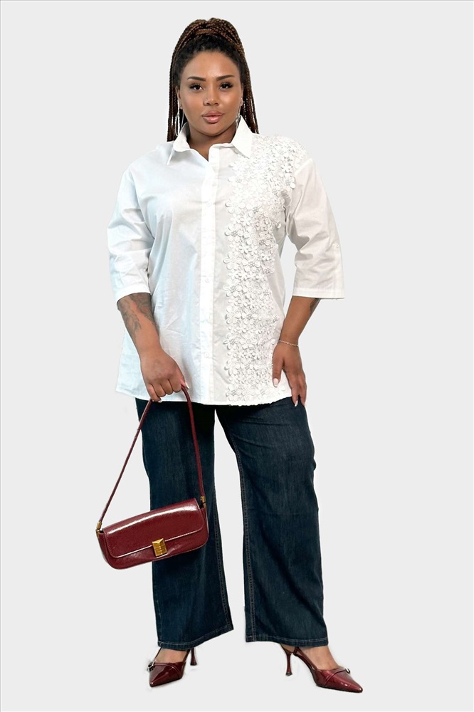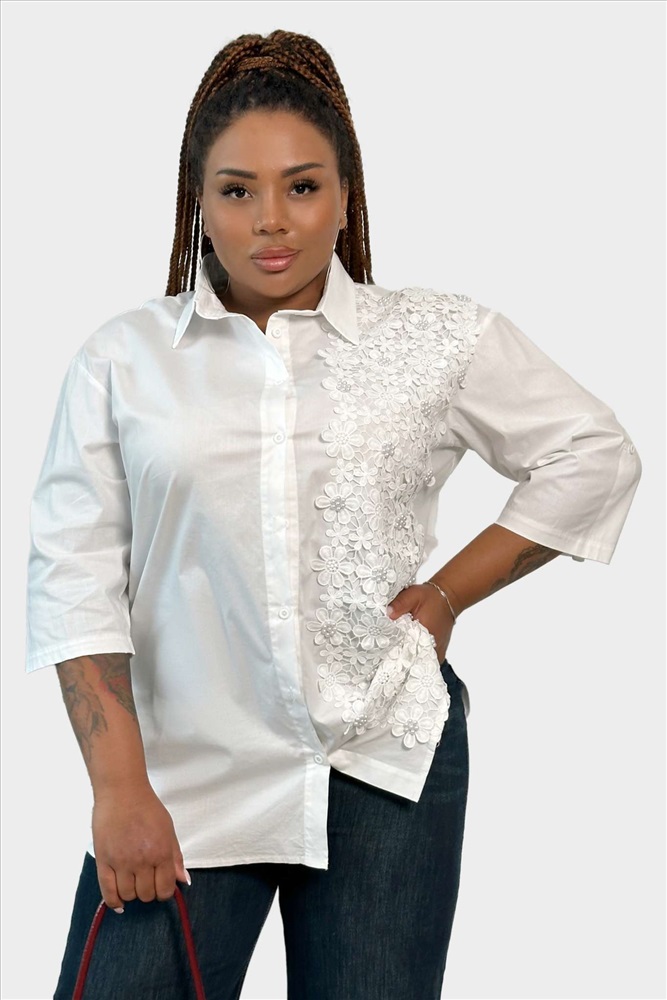 Рубашка удлиненная с объемными цветочками в кружево белая