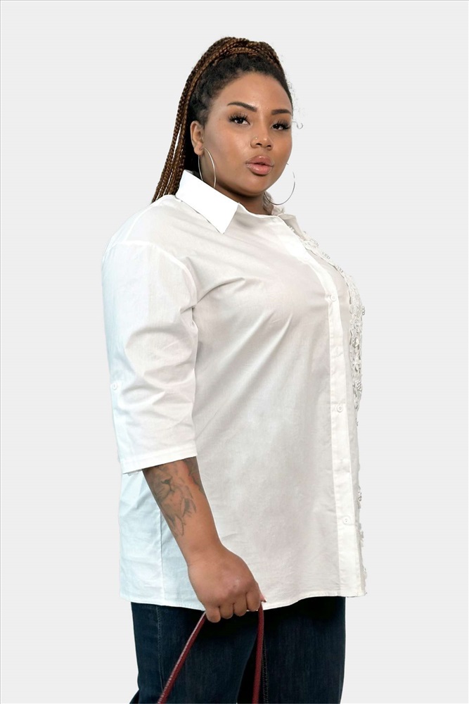 Лаконичная рубашка прямого кроя из мягкого материала - идеальный вариант для женщин, ценящих простоту и элегантность. Модель привлекает оригинальным дизайном. Круглый вырез дополнен отложным воротником. Рубашка застегивается спереди на изящные пуговки. Рукава длиной 3/4 можно при желании присобрать патами. Нежное кружево по переду усыпано оригинальными бусами, что добавляет нарядности и женственности. Свободный крой искусно обыгрывает силуэт, а мягкий, приятный телу материал подарит комфорт на весь день. Отлично подходит для комбинирования с брюками и юбками.