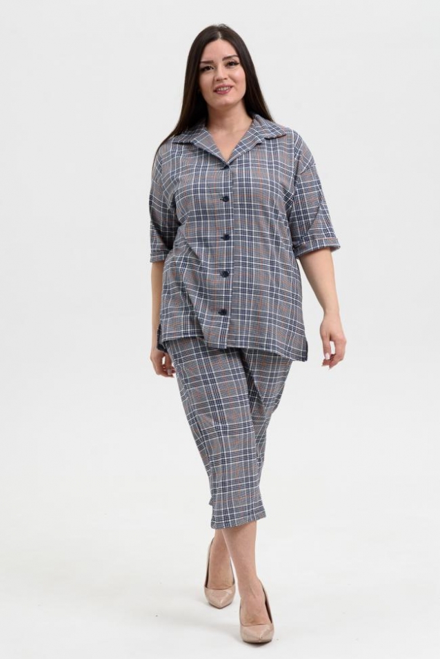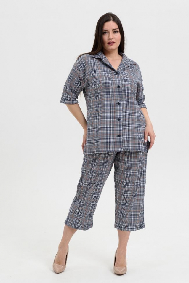 Рубашка-блузка из лёгкого мягкого трикотажного полотна прямого силуэта, на пуговицах, отложной воротник втачной рукав с манжетами, застёжка на пуговицах. Изделие хорошо сочетается с брюками, юбками, бриджами.
