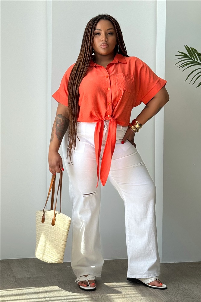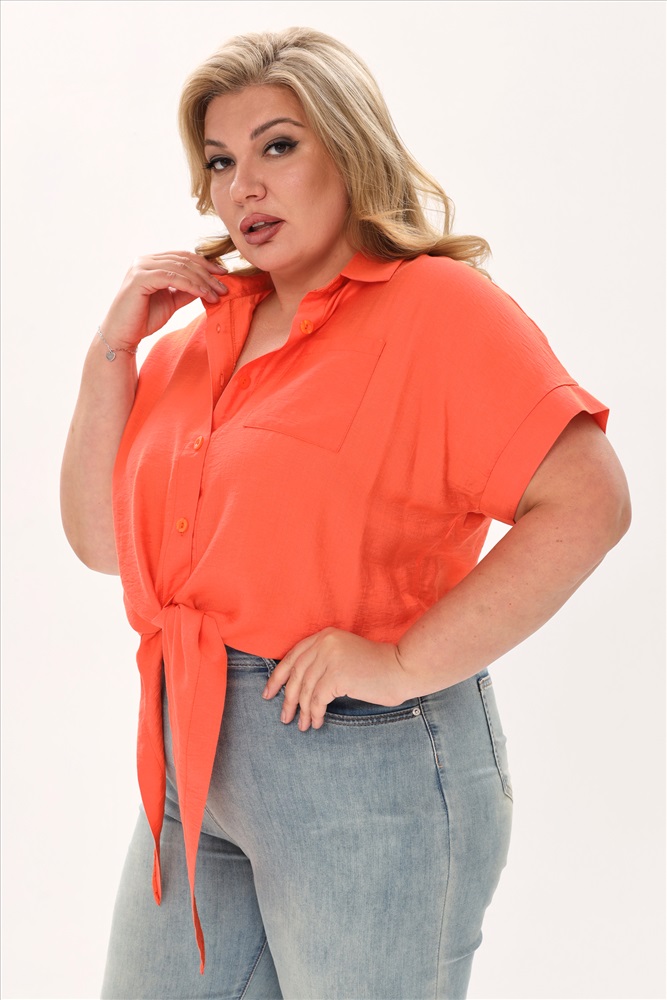 Укороченная рубашка прямого кроя из струящегося материала с крэш эффектом. Короткие цельнокроеные рукава оформлены по низу небольшой планкой. Круглый вырез дополнен классическим отложным воротником. Модель застёгивается на небольшие пуговки под планку. Оригинальные завязки по переду способствуют оптимальной посадке по фигуре. Накладной карман на груди добавляет практичности. Рубашка превосходно сочетается как юбками, так и с брюками и шортами.