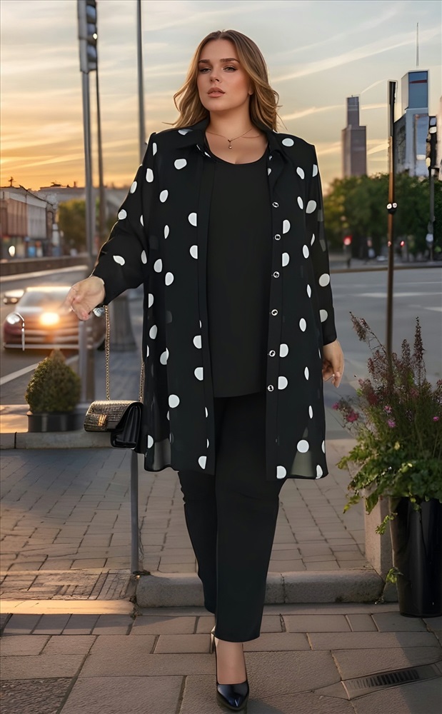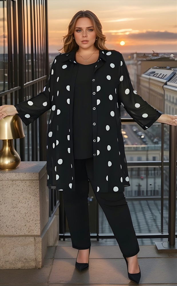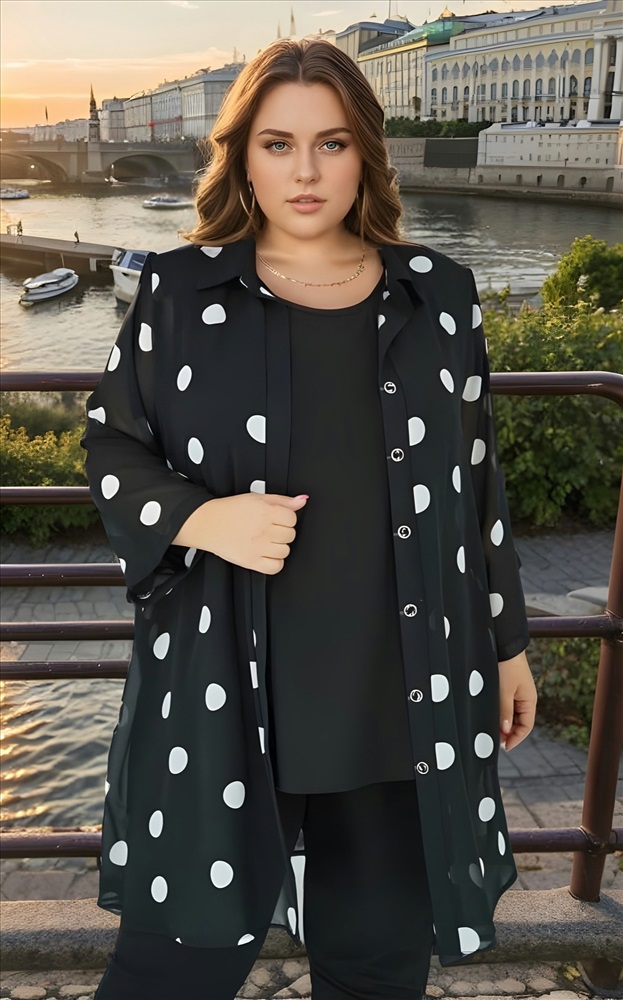 Рубашка двойка шифон "горох" удлиненная черная