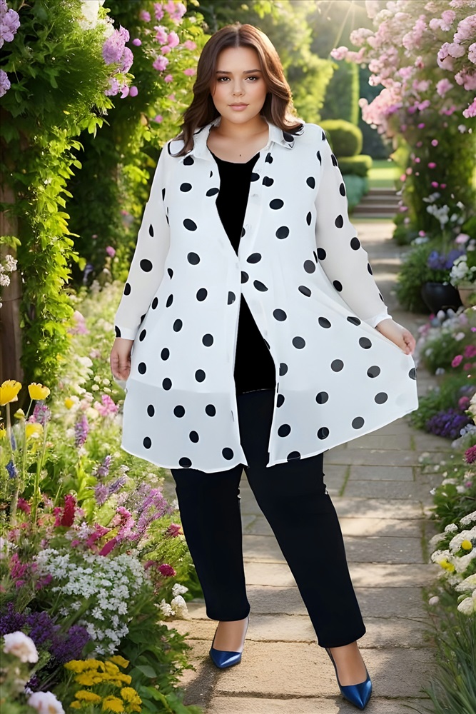 Комплект состоит из рубашки и топа. Удлиненная рубашка прямого кроя выполнена из мягкого шифона. Модель привлекает внимание оригинальным дизайном. Рубашка застегивается спереди по всей длине на пуговицы под однотонную планку. Имеет классический отложной воротник и свободные рукава полной длины. Актуальный гороховый принт добавляет динамичности.