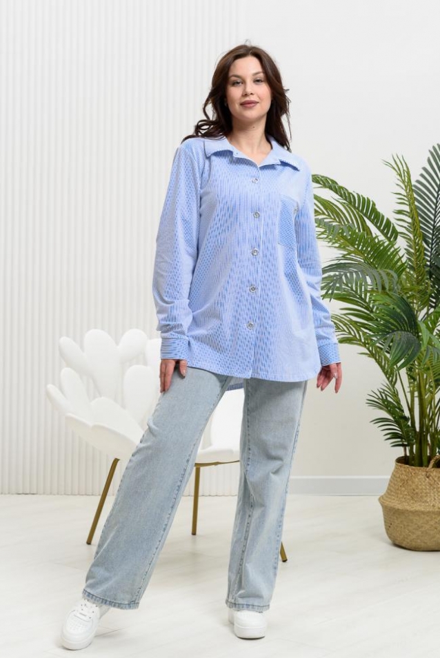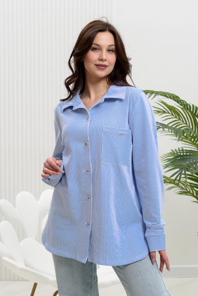 Рубашка женская прямого силуэта с отложным воротником. Застежка на петли-пуговицы. Рукав длинный, втачной с манжетой. Низ туники фигурный, спинка несколько длиннее полочки. На полочке нагрудный карман. Ткань в мелкую полоску особенно актуальна в этом сезоне.