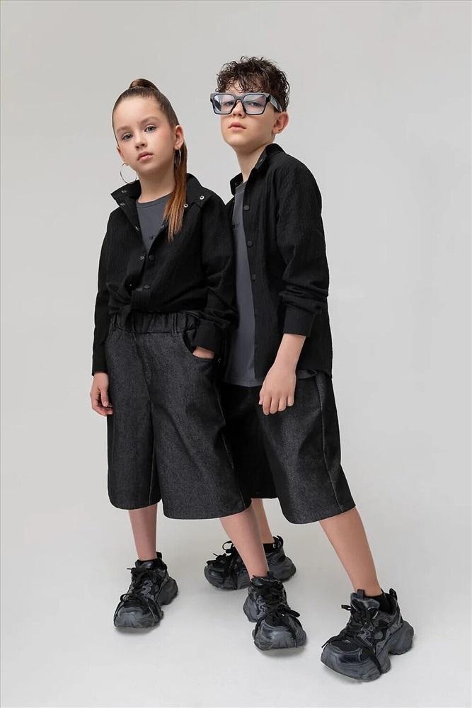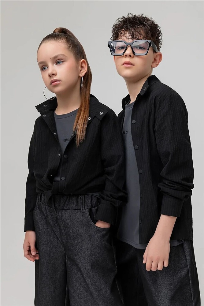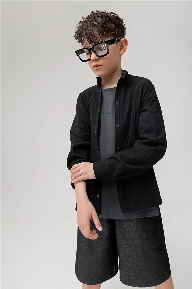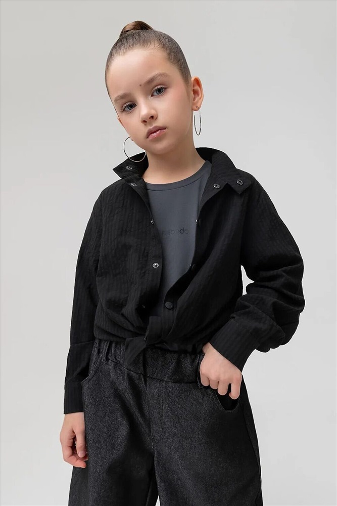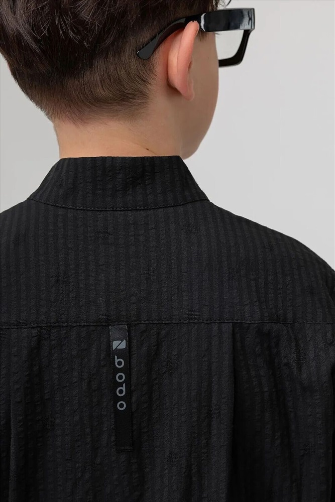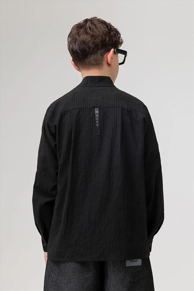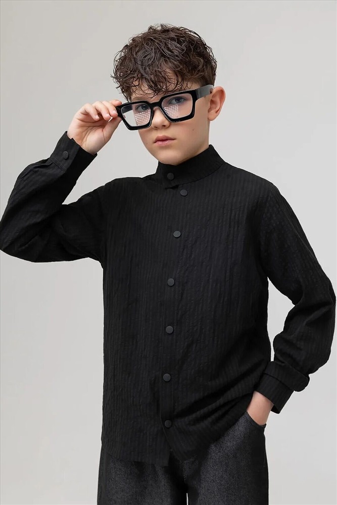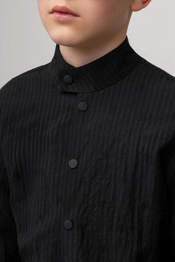 Прямая рубашка без подкладки на кнопках. Рубашка с воротником-стойка, длинные рукава с манжетой на кнопке. Низ изделия прямой. По низу рукава — защип. Ткань рубашечная, плотность 95 гр/м.кв. Тонкая, мягкая и легкая ткань с жаккардовой поверхностью. Обладает высокими гигиеническими свойствами, прочная, износостойкая. Вдоль всего полотна жаккардовый рисунок - полоска, шириной 0,4см.