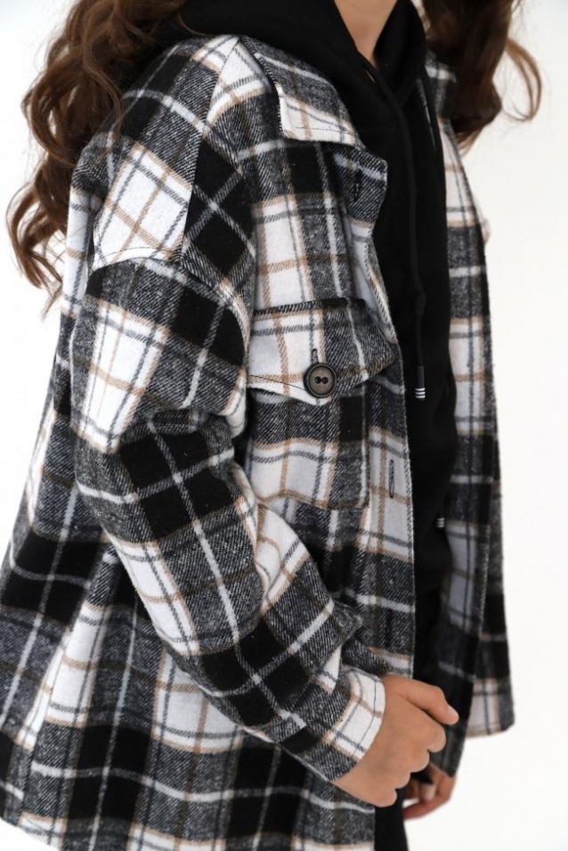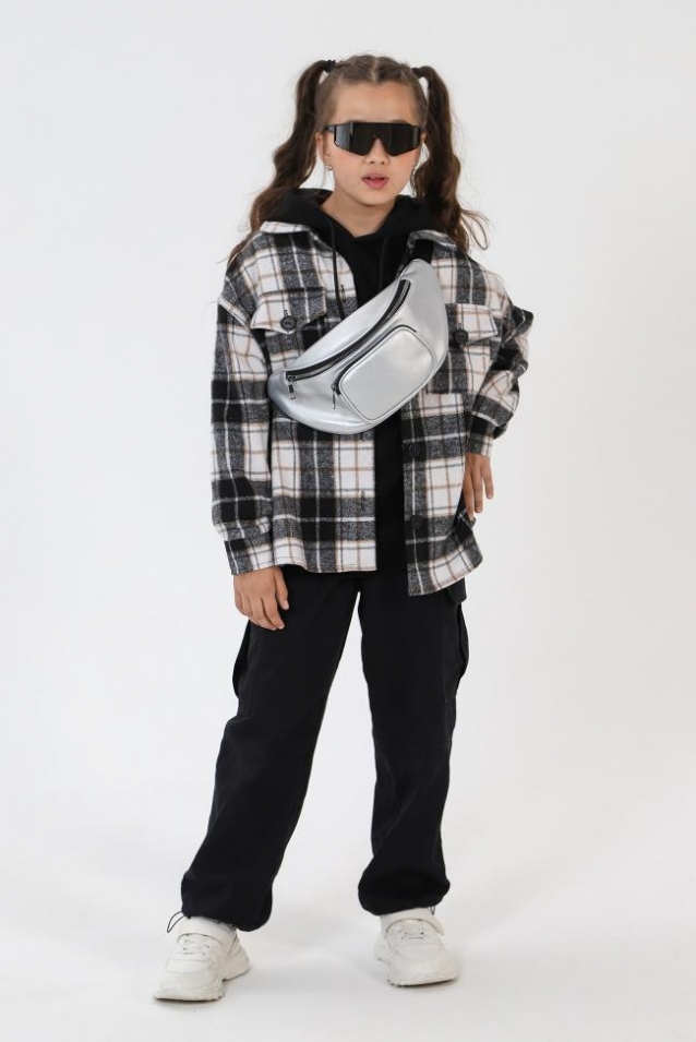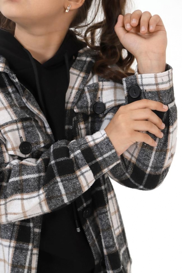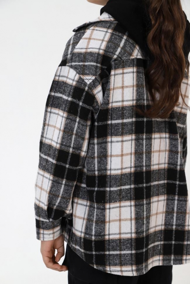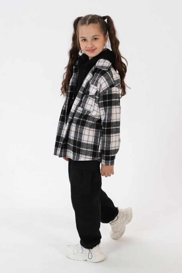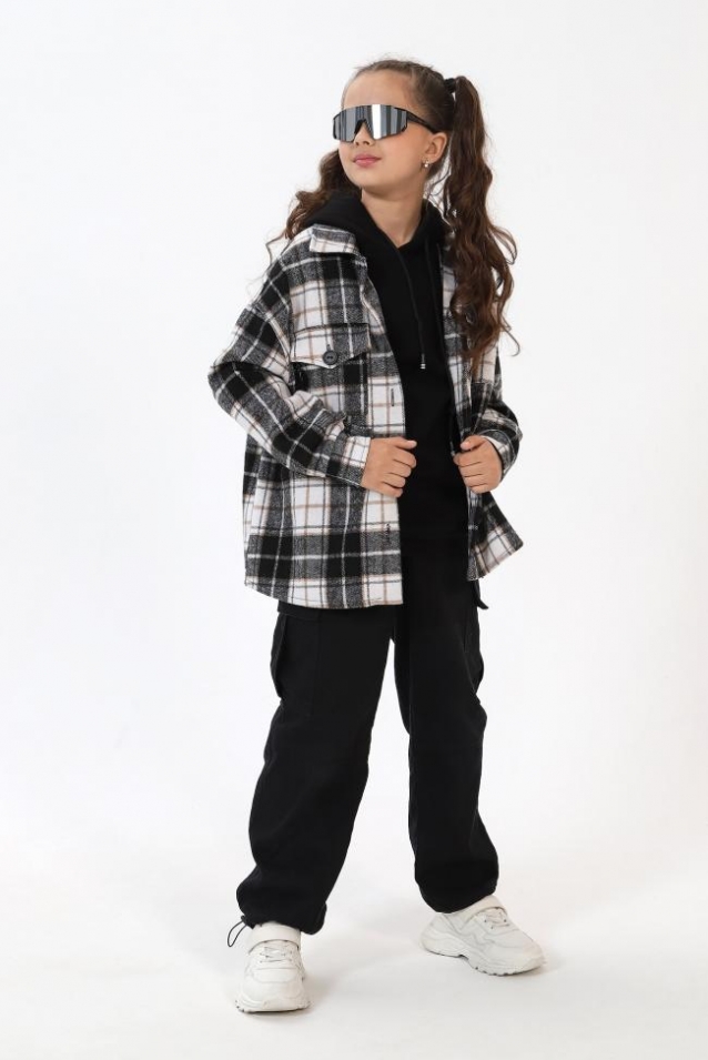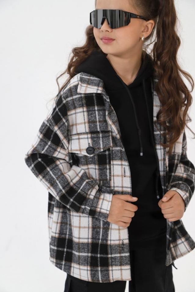 Рубашка для девочки из тканого полотна с рисунком в крупную клетку, длинными втачными рукавами с разрезами на притачных манжетах, застегивающимися на обметанные петли и пуговицы, фигурной линией низа и стояче-отложным воротником. Полочки - с двумя нагрудными карманами и клапанами фигурной формы. Спинка - с притачной кокеткой, выкроенной по косой. В швах соединения манжет с рукавами обработаны по одной складочке. При эксплуатации изделия следует обратить внимание на то, что после ВТО и стирки материал дает усадку по ширине и длине.