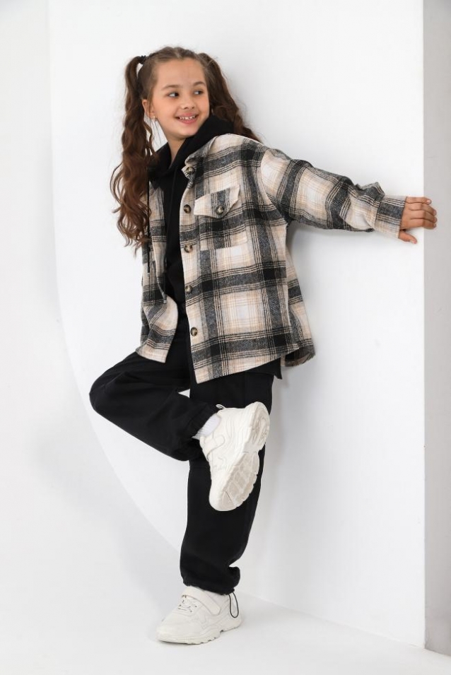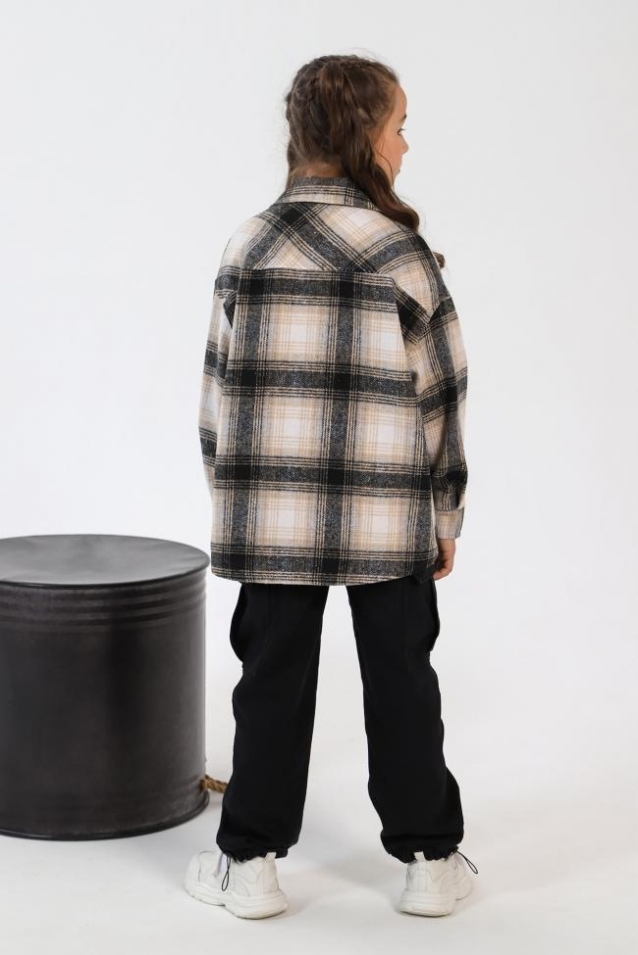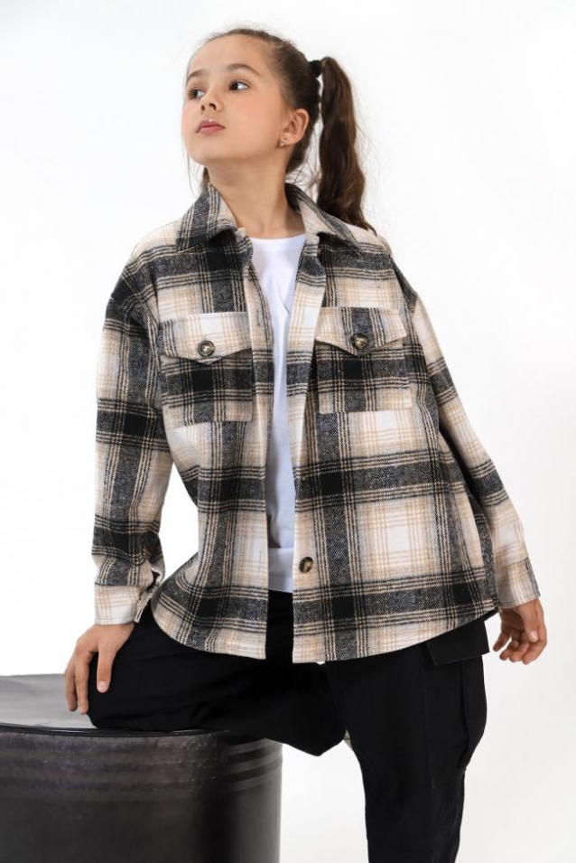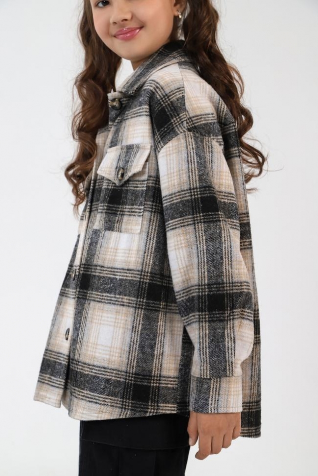 Рубашка для девочки из тканого полотна с рисунком в крупную клетку, длинными втачными рукавами с разрезами на притачных манжетах, застегивающимися на обметанные петли и пуговицы, фигурной линией низа и стояче-отложным воротником. Полочки - с двумя нагрудными карманами и клапанами фигурной формы. Спинка - с притачной кокеткой, выкроенной по косой. В швах соединения манжет с рукавами обработаны по одной складочке. При эксплуатации изделия следует обратить внимание на то, что после ВТО и стирки материал дает усадку по ширине и длине. Комментарии к товару