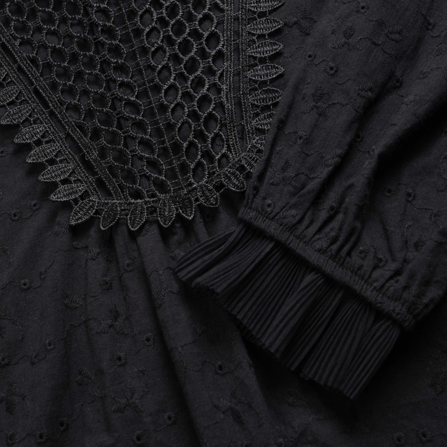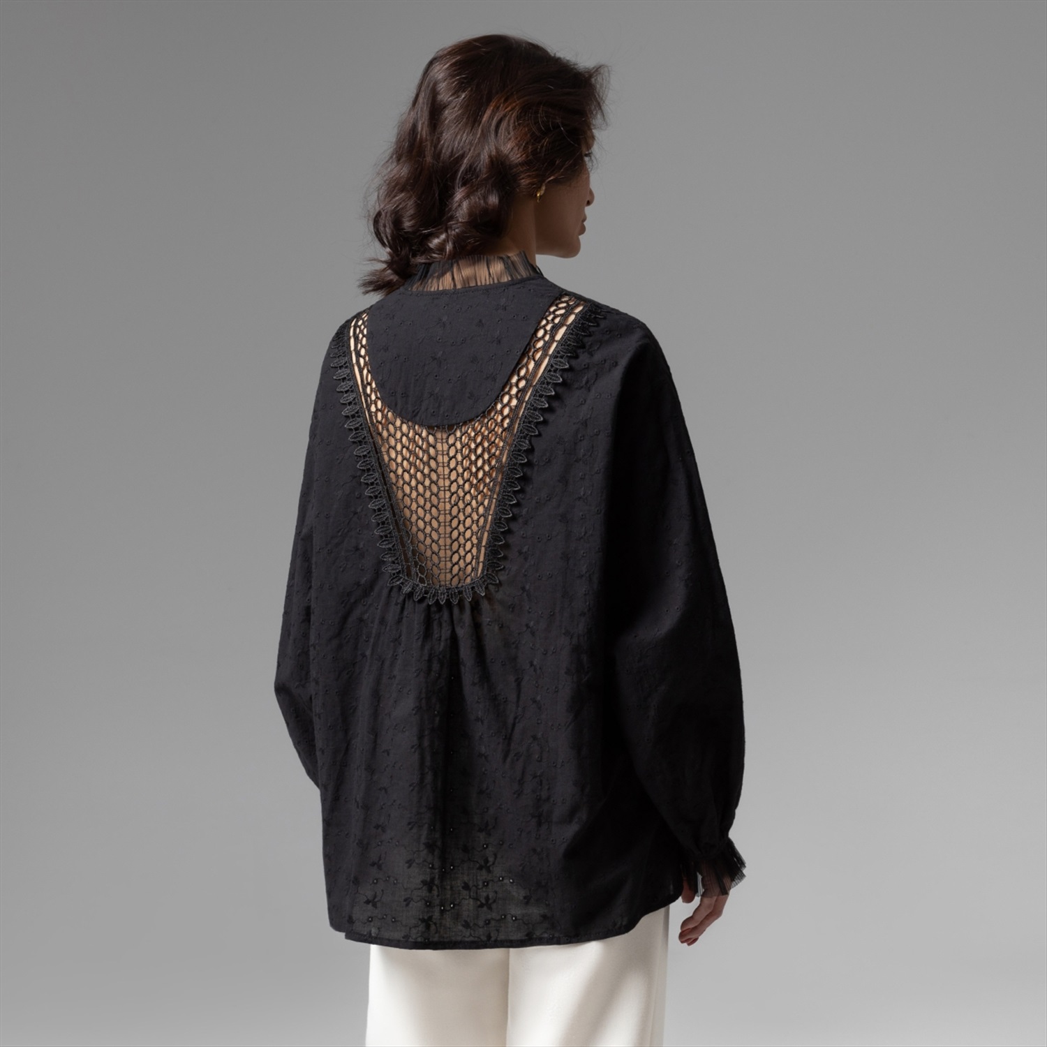 Гармония женственности и тайны. Черный цвет раскрывает глубину, а прозрачное шитьё на спинке добавляет интриги. Лёгкость ткани, свободный крой...за каждым вашим движением хочется следить. Стиль, который завораживает. Изделие застегивается на пуговицы. Акцентный прозрачный декор из крупного шитья по спинке изделия. Акцентный декор из сетки-гофре на манжетах и по вырезу. Высокий контроль качества пошива.