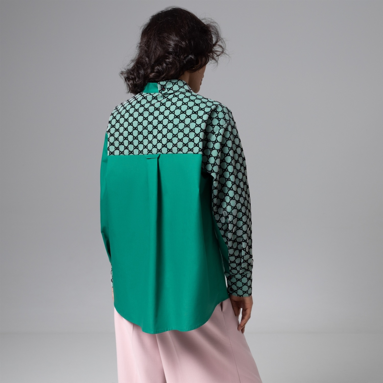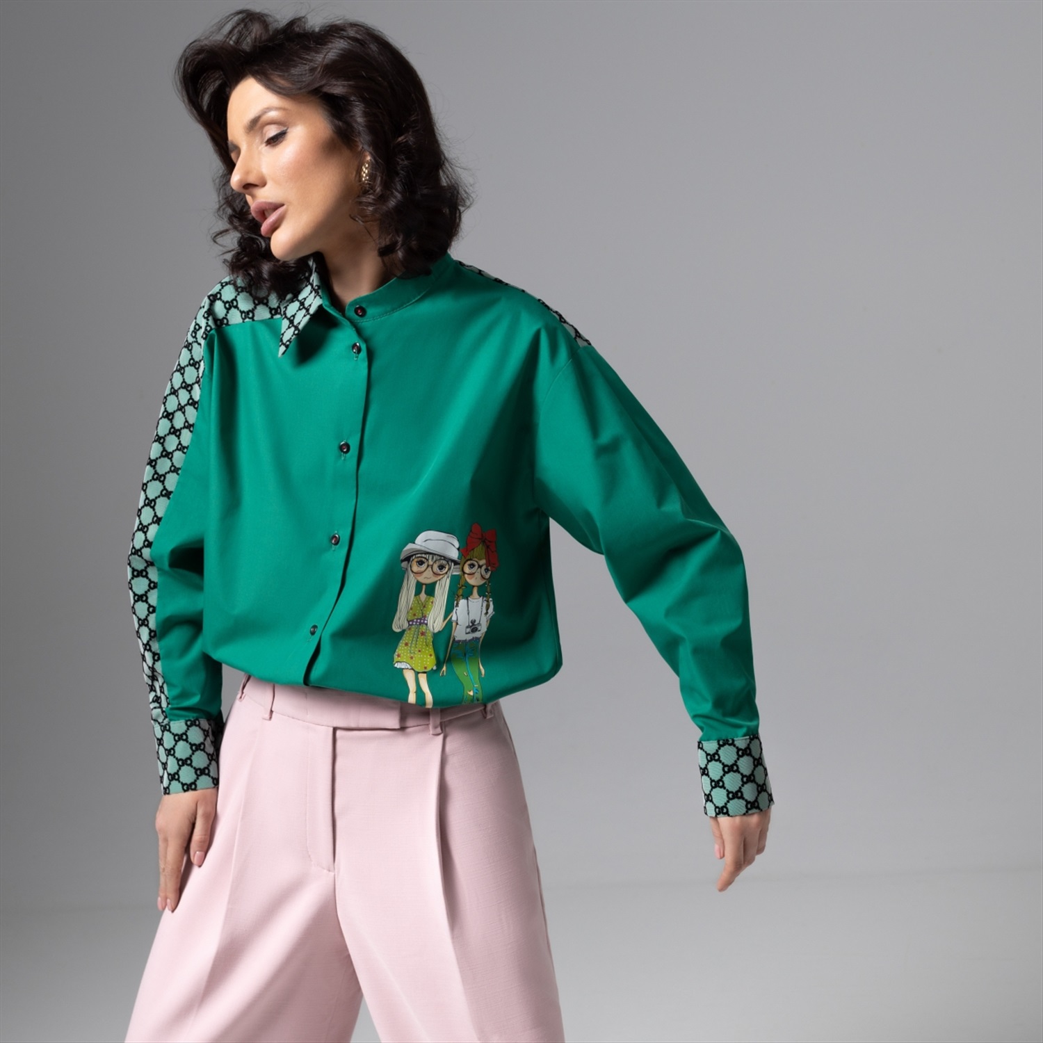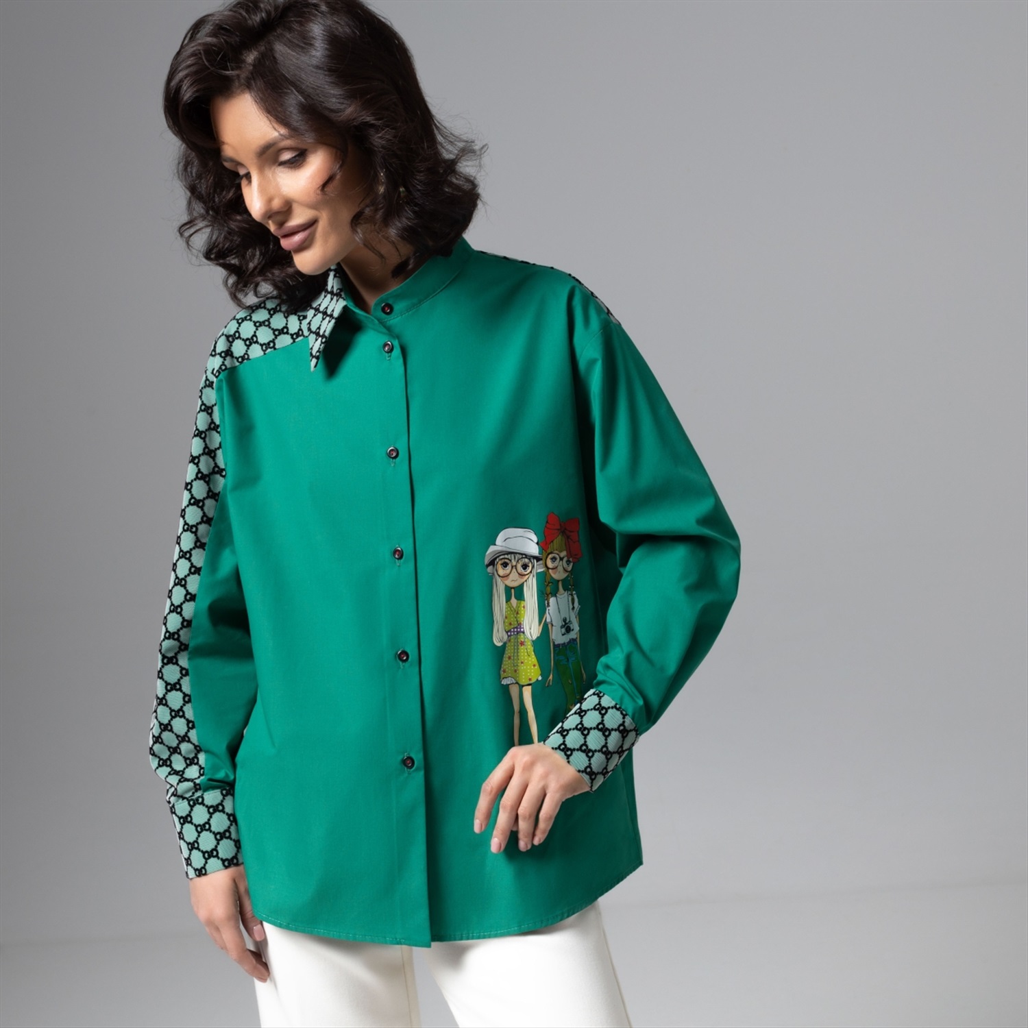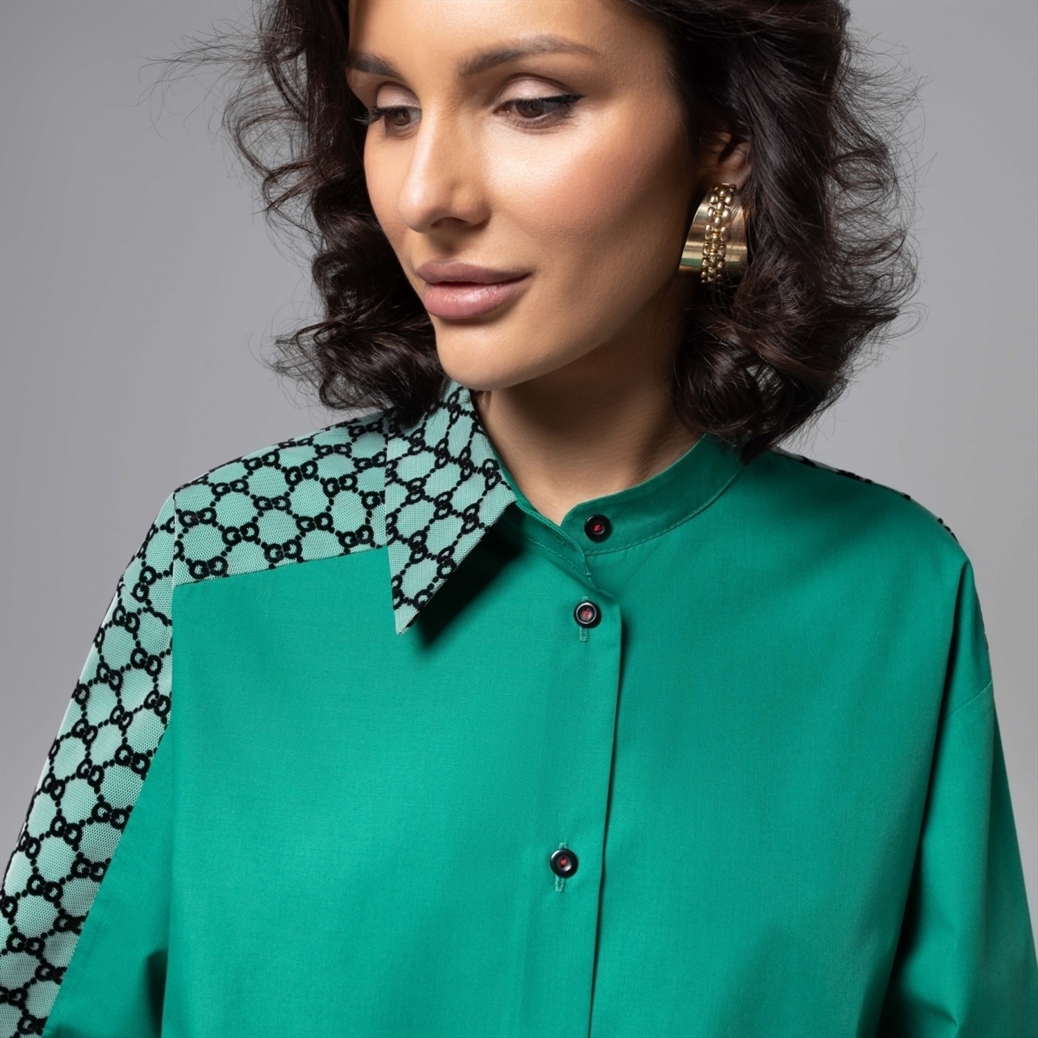 Быть уникальной в рубашке CHARUTTI из коллекции PREMIUM. Дорогой изумрудный цвет и детали... Никуда без деталей. Рубашка классического кроя из комбинации разных видов материла, материал декора – сетка с бархатистым нанесением узора. Высокое качество печати принта на ткани. Контрастная фурнитура. Пуговицы пришиты контрастными красными нитками. Ворот асимметричный – комбинация воротника-стойки и классического. Комментарии к товару