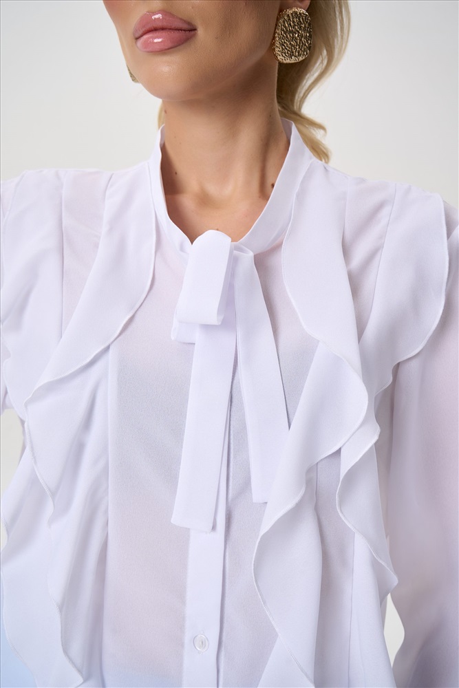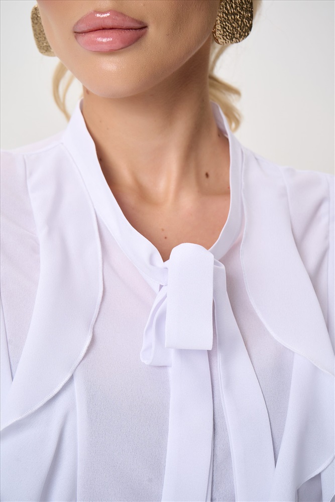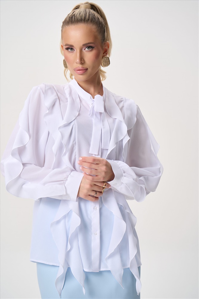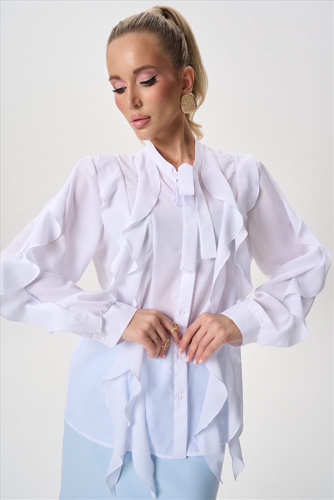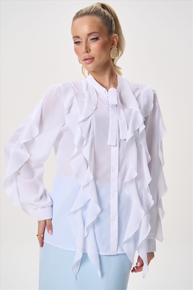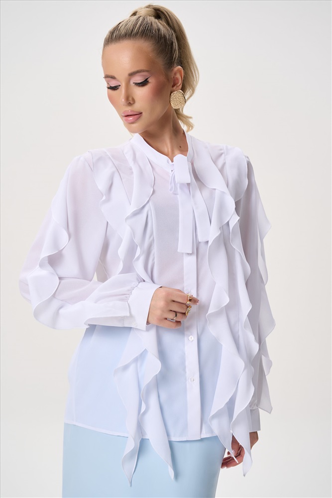 Состав: П/э – 60%, вискоза – 30%, эластан – 10% Описание Элегантная блузка с архитектурными воланами — современное прочтение женственности и лёгкости. Модель сочетает выразительный дизайн и комфортную посадку, создавая утончённый силуэт, который одинаково уместен как в деловом гардеробе, так и в вечерних образах. Воздушная фактура ткани мягко движется при каждом шаге, добавляя образу динамику и изысканность. Силуэт:свободный, слегка расширенный книзу, не сковывает движения Конструкция:центральная застёжка на пуговицы, аккуратно скрытая планкой Ворот:аккуратная стойка, визуально вытягивает линию шеи Декор: многоуровневые асимметричные воланы по переду изделия и рукавам Рукав:длинный, объёмный, с мягкой сборкой — создаёт выразительный силуэт Посадка:комфортная, подходит для разных типов фигуры Ткань:лёгкая,струящаяся, хорошо держит форму воланов и практически не мнётся