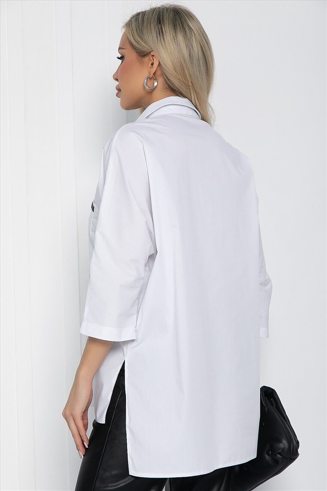 Артикул: Б12614-10. Тип ткани: смесовая. Состав: 95% хлопок, 5% эластан. Материал: хлопок. Цвет: белый. Принт: отсутствует. Вид застежки: пуговицы. Силуэт: свободный. Карманы: есть. Подкладка: отсутствует. Декоративные элементы: блёстки на карманах. Длина по переду (ассиметричный крой): 44/ 65 см, 46/ 66 см, 48/ 68 см, 50/ 69 см, 52/ 71 см, 54/ 72 см. Длина по спинке от верхней точки плеча: 44/ 71 см, 42/ 72 см, 48/ 73 см, 50/ 74 см, 52/ 75 см, 54/ 76 см. Размер изделия на модели: 44 Рост модели: 168 см.