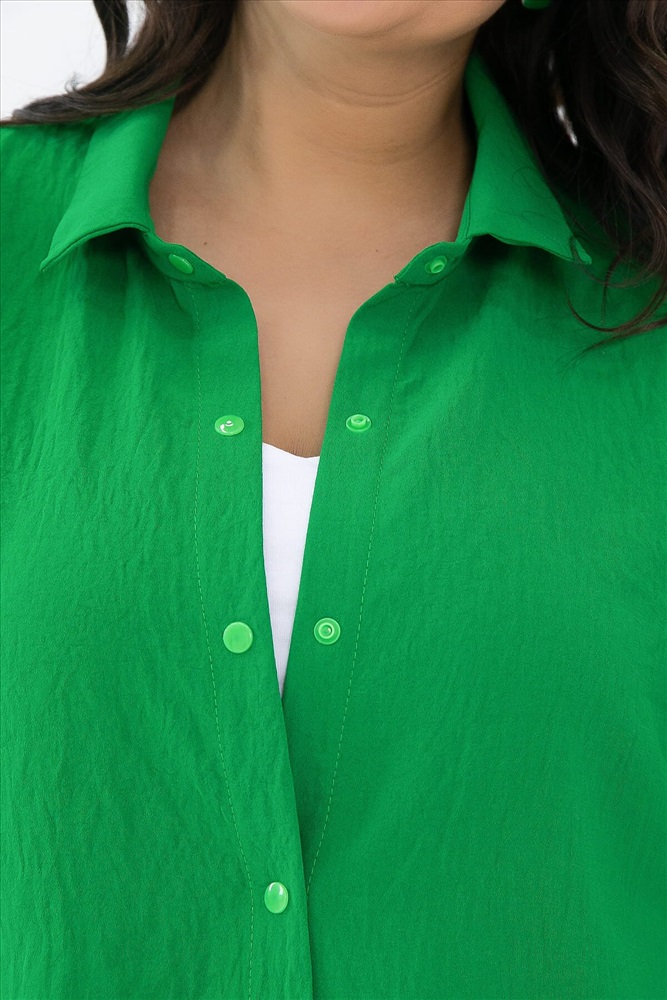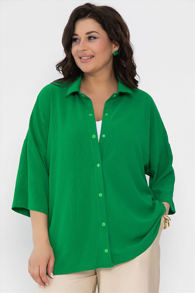 Состав: 80% вискоза, 20% полиэстер. Материал: сингапур. Цвет: зелёный. Принт: отсутствует. Силуэт: свободный. Карманы: отсутствуют. Подкладка: отсутствует. Вид застежки: кнопки. Декоративные элементы: отсутствуют. Длина по переду (ассиметричный крой): 44-46/ 70 см, 48-52/ 73 см, 54-56/ 75 см. Длина по спинке от верхней точки плеча: 44-46/ 77 см, 48-52/ 80 см, 54-56/ 82 см.