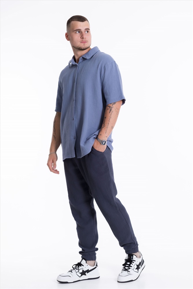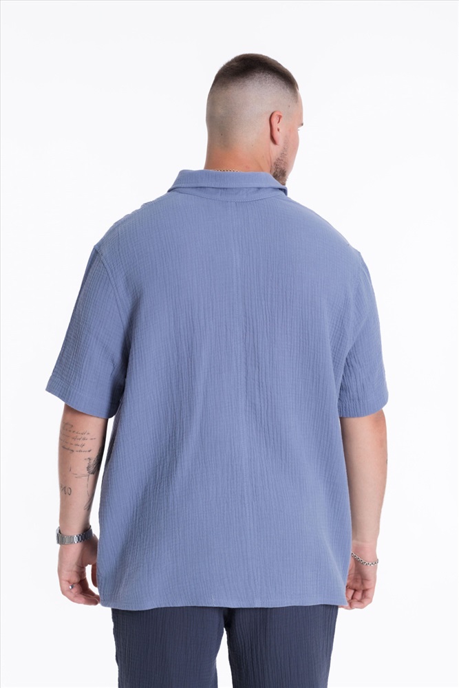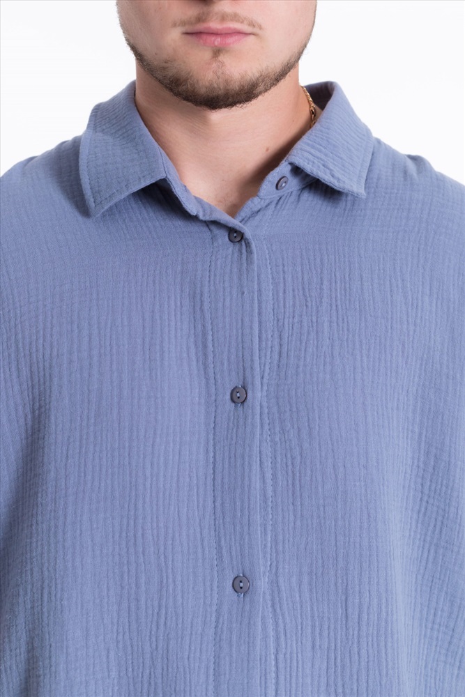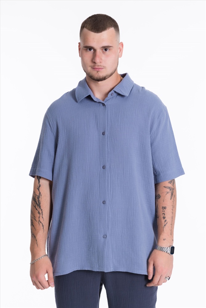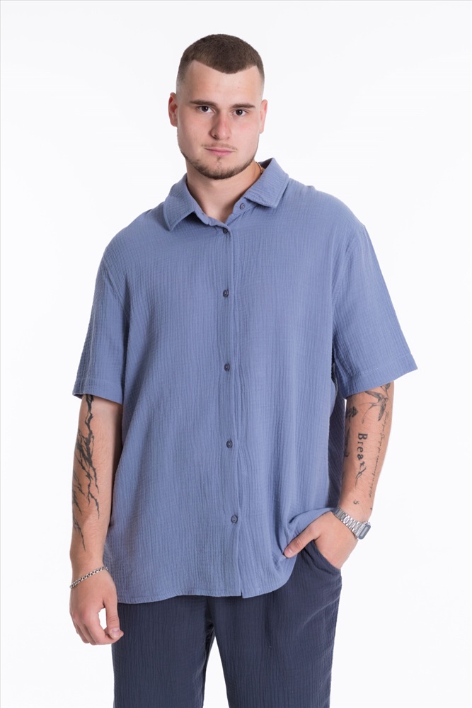 Застежка: Пуговицы С капюшоном: Нет С карманами: Нет Сезон: Летний Силуэт: Свободный Состав: Хлопок 100% Цвет Номенклатуры: серо-голубой Мужская рубашка из полотна "муслин". Ворот, втачной короткий рукав, свободный крой, застежка спереди на пуговицы. Комментарии к товару