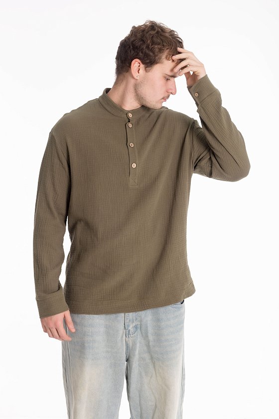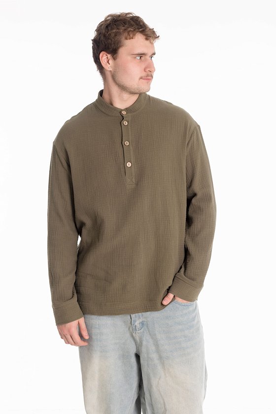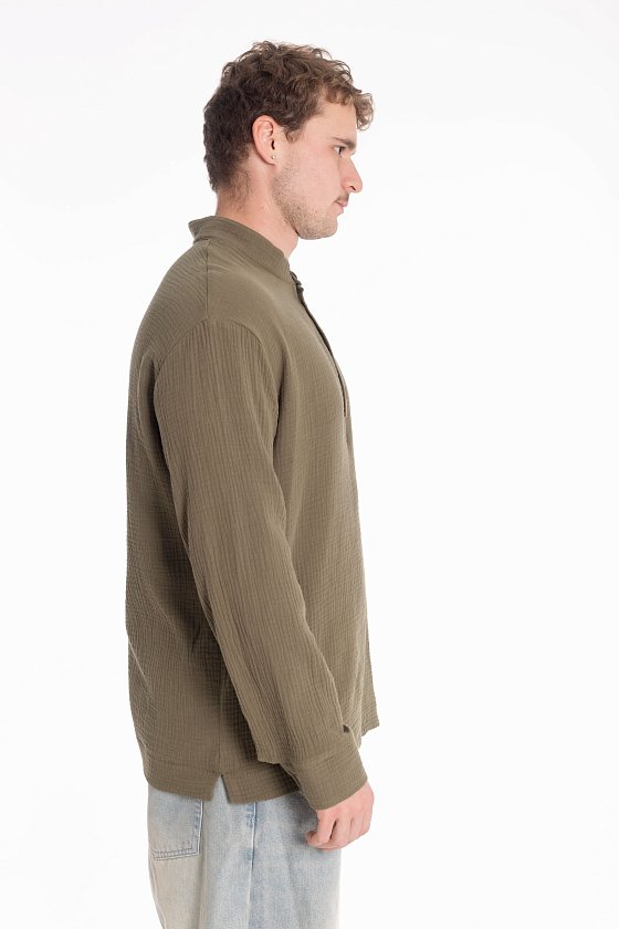 Мужская рубашка с длинным рукавом и спущенной линией плеча выполнена из муслина. Воротник-стойка, короткая застежка на пуговицы, внизу по бокам декоративные разрезы.