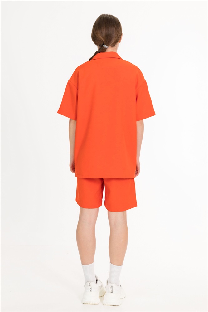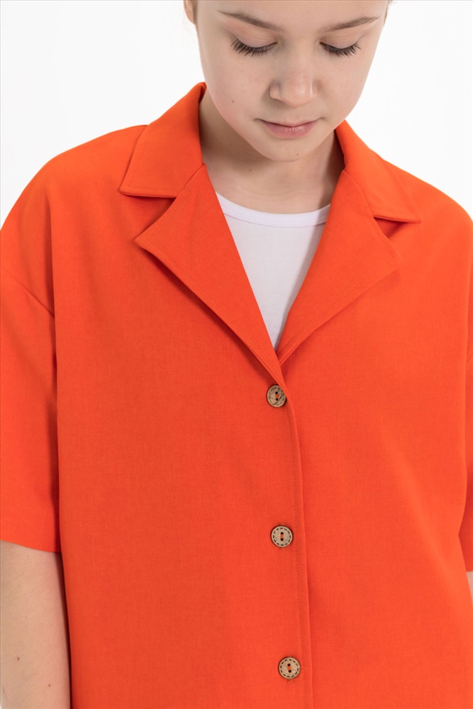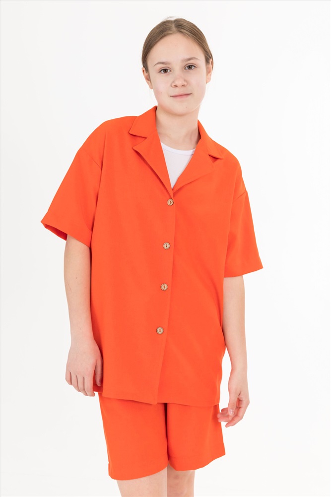 Рубашка — стильный и практичный элемент гардероба. Она изготовлена из практичного однотонного полотна, имитирующего лён. Рубашка имеет короткий рукав, застёгивается на пуговицы и дополнена отложным воротником.