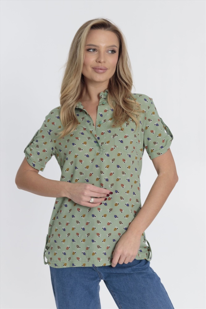 Рубашка женская с воротником-стойкой с застежкой на пуговицы, короткий рукав, нагрудный карман, рукава и низ по бокам оформлены планкой с пуговицами.