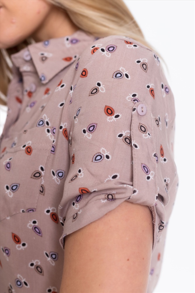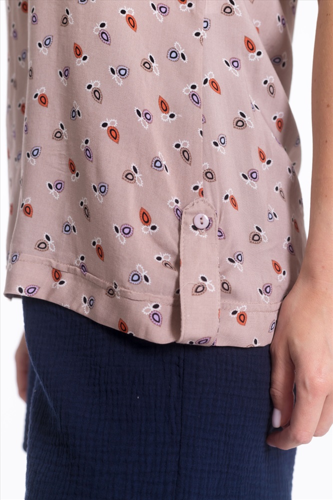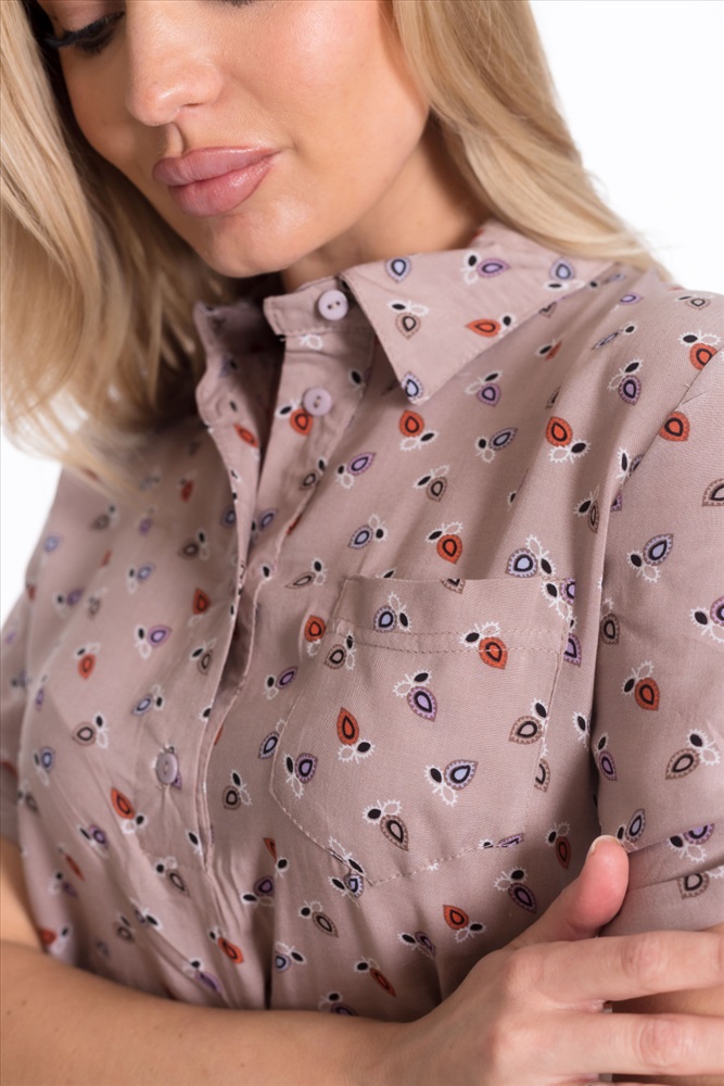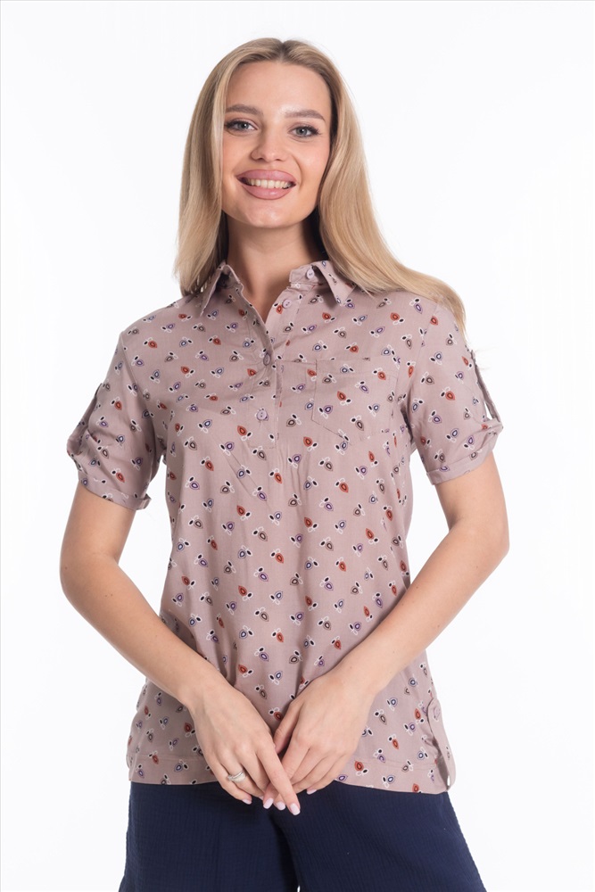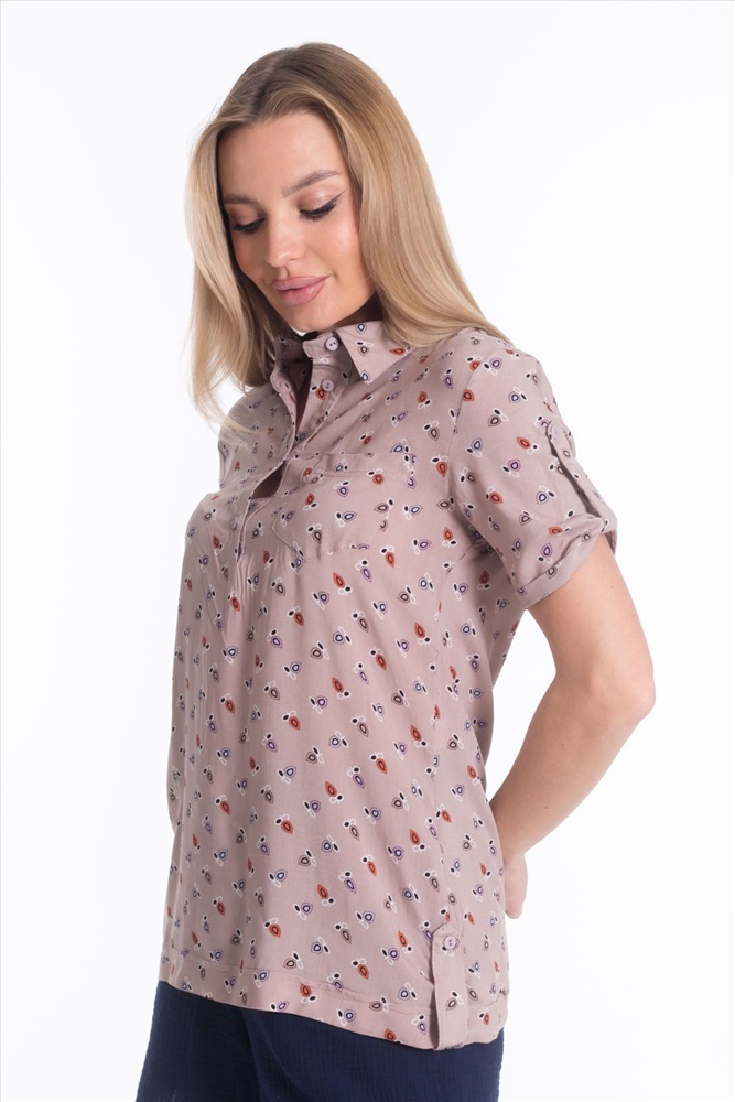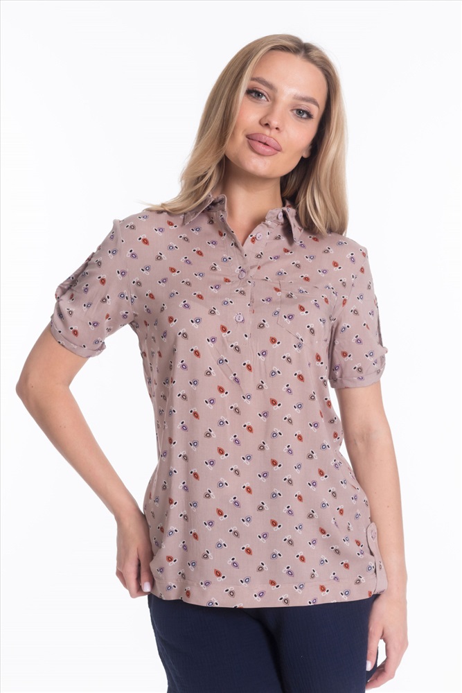 Застежка: Пуговицы С капюшоном: Нет С карманами: Нет Сезон: Летний Силуэт: Прямой Состав: Хлопок 80% Полиэстер 20% Цвет Номенклатуры: бежевый/фиолетовый Рубашка женская с воротником-стойкой с застежкой на пуговицы, короткий рукав, нагрудный карман, рукава и низ по бокам оформлены планкой с пуговицами. Комментарии к товару