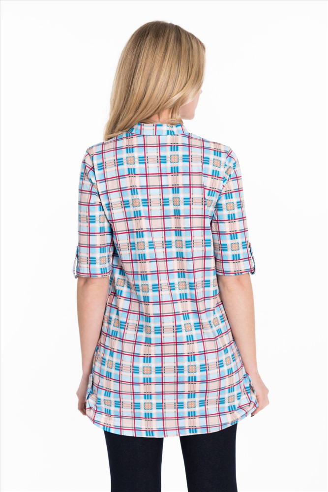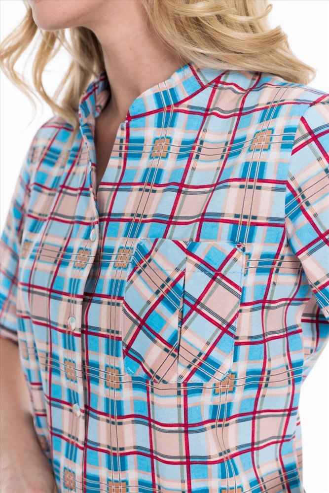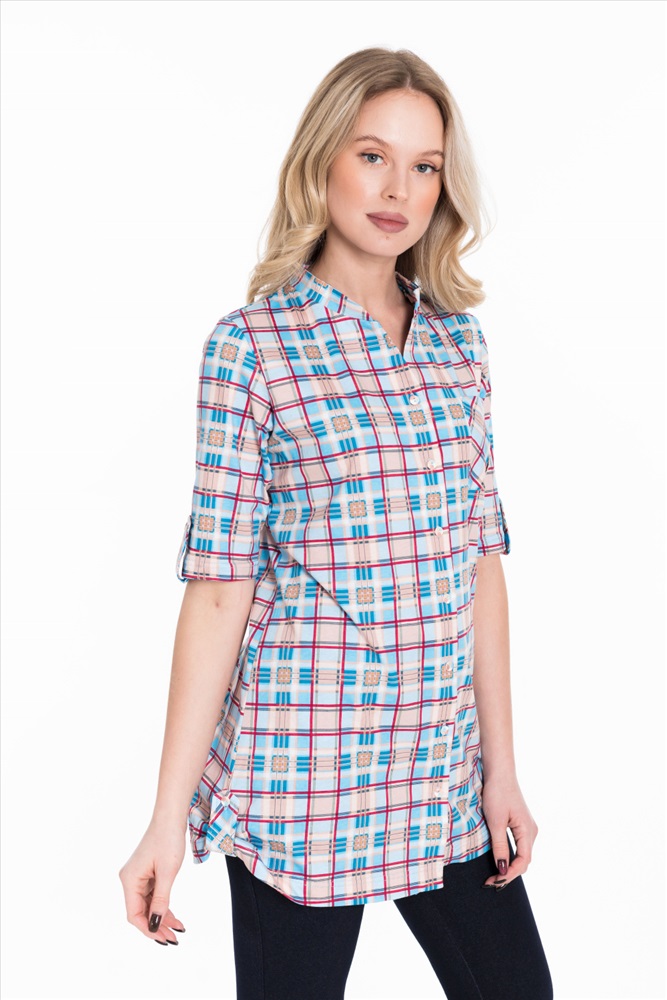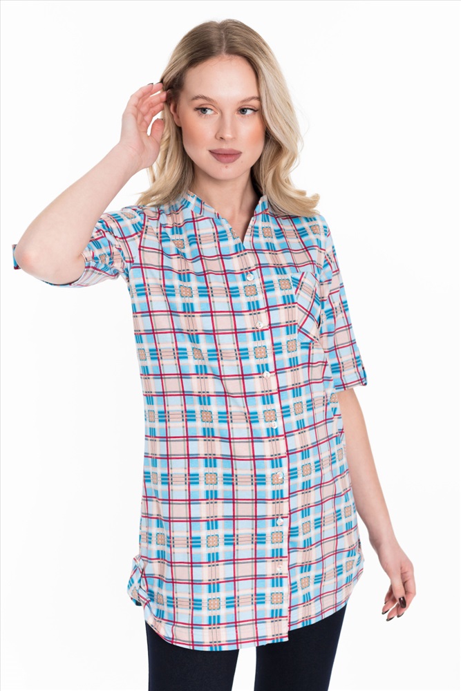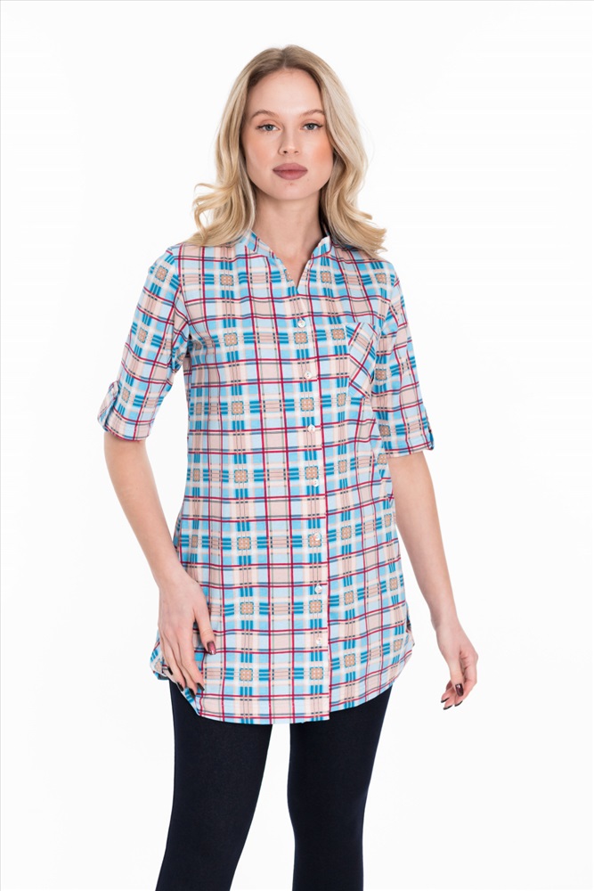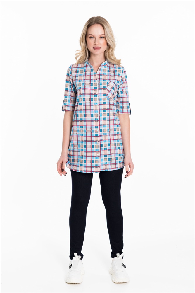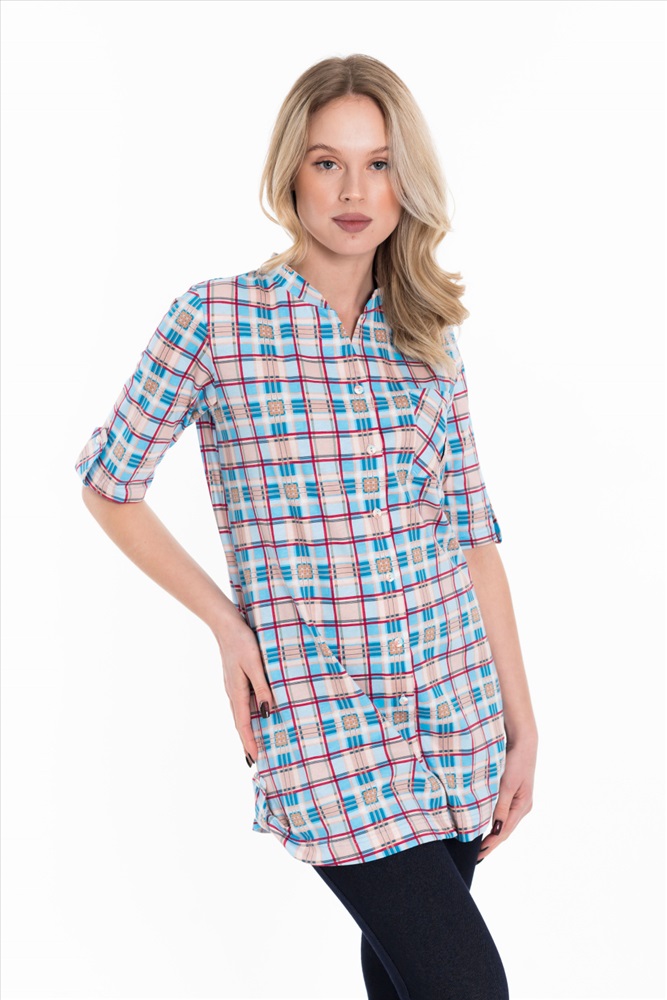 Застежка: Пуговицы С капюшоном: Нет С карманами: Да Сезон: Всесезонный Силуэт: Прямой Состав: Хлопок 100% Цвет Номенклатуры: голубой Рубашка с рукавом длиной 3/4 и центральной застёжкой на пуговицы. Воротник-стойка, спереди накладной карман, на рукавах и снизу по бокам отделка паты. Комментарии к товару