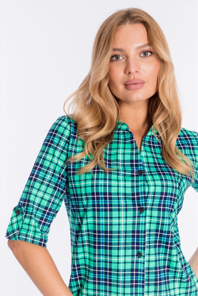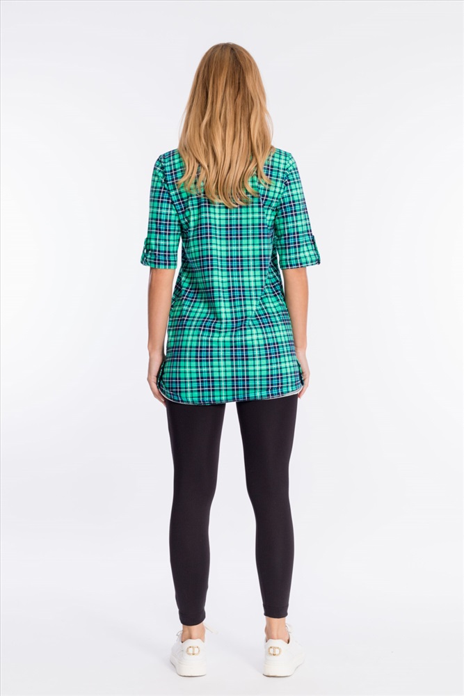 Рубашка с рукавом длиной 3/4 и центральной застёжкой на пуговицы. Воротник-стойка, спереди расположен накладной карман, на рукавах и снизу по бокам отделка паты.
