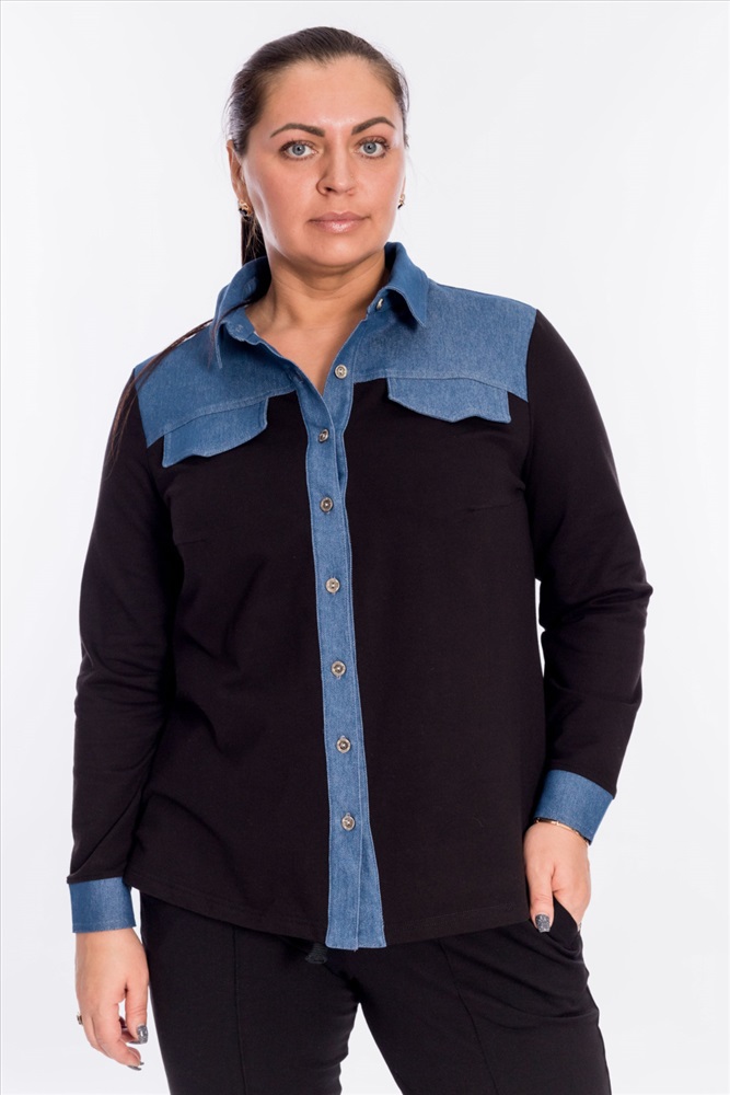 Застежка: Пуговицы С капюшоном: Нет С карманами: Да Сезон: Всесезонный Силуэт: Прямой Состав: Хлопок 95% Лайкра 5% Цвет Номенклатуры: черный Рубашка выполнена из футера с лайкрой и деталями из джинсового материала. Спереди и на спинке кокетки. Сзади под кокеткой петелька, а спереди клапаны. Воротник на отрезной стойке. Спереди застёжка на пуговицы на притачной планке. Рукав с манжетой на пуговице. Комментарии к товару