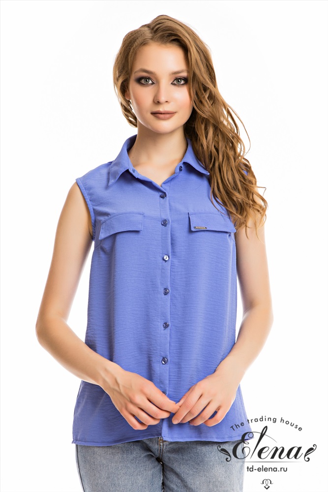 Застежка: Пуговицы С капюшоном: Нет С карманами: Нет Сезон: Летний Силуэт: Свободный Состав: Полиэстер 100% Цвет Номенклатуры: васильковый Рубашка из однотонного шёлкового крепа. Без рукавов, с застёжкой на пуговицы и воротником. На полочках нагрудные вытачки и декоративные клапаны. Комментарии к товару