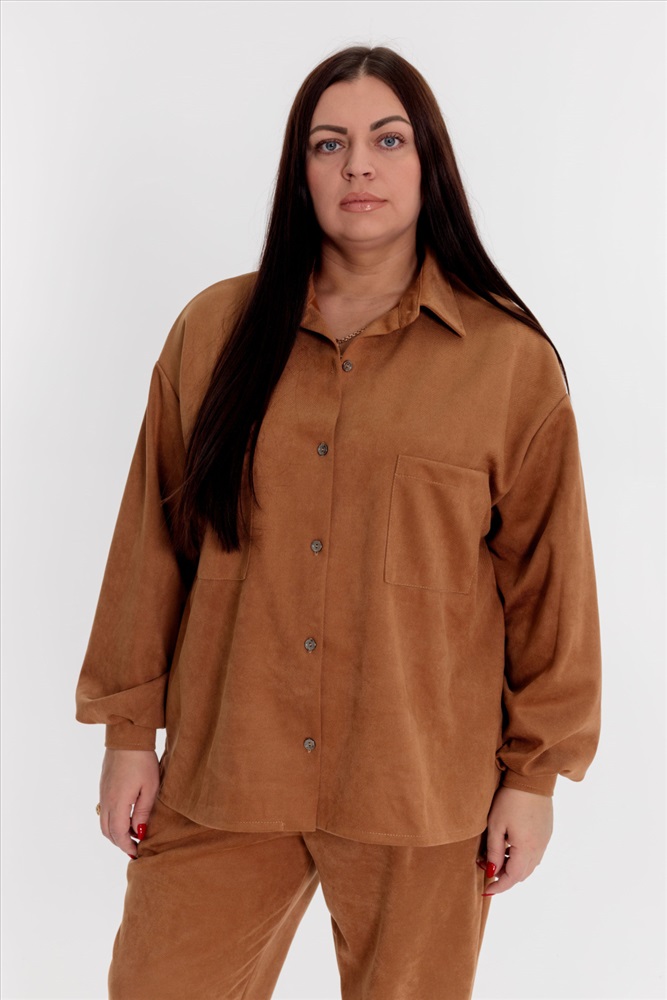 Застежка: Пуговицы С капюшоном: Нет С карманами: Нет Сезон: Всесезонный Силуэт: Свободный Состав: Полиэстер 95% Лайкра 5% Цвет Номенклатуры: коричневый Рубашка из полотна "замша-диагональ". Свободный силуэт, спущенная линия плеча, на полочках карманы, в боковых швах разрезы, низ разноуровневый, рукав на манжете с застежкой на пуговицу, низ рукава заложен в складку. Комментарии к товару