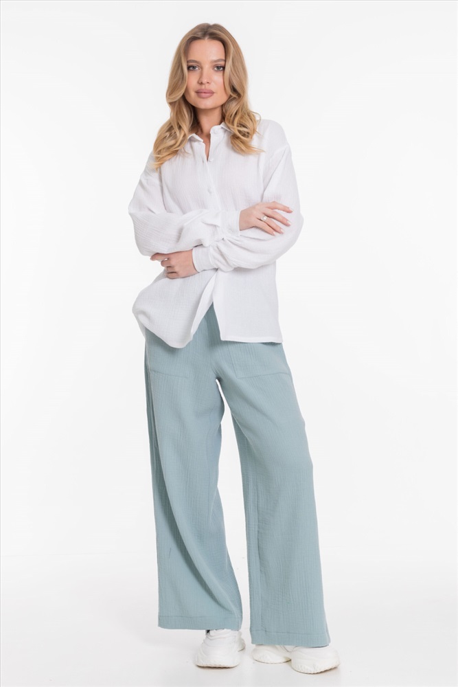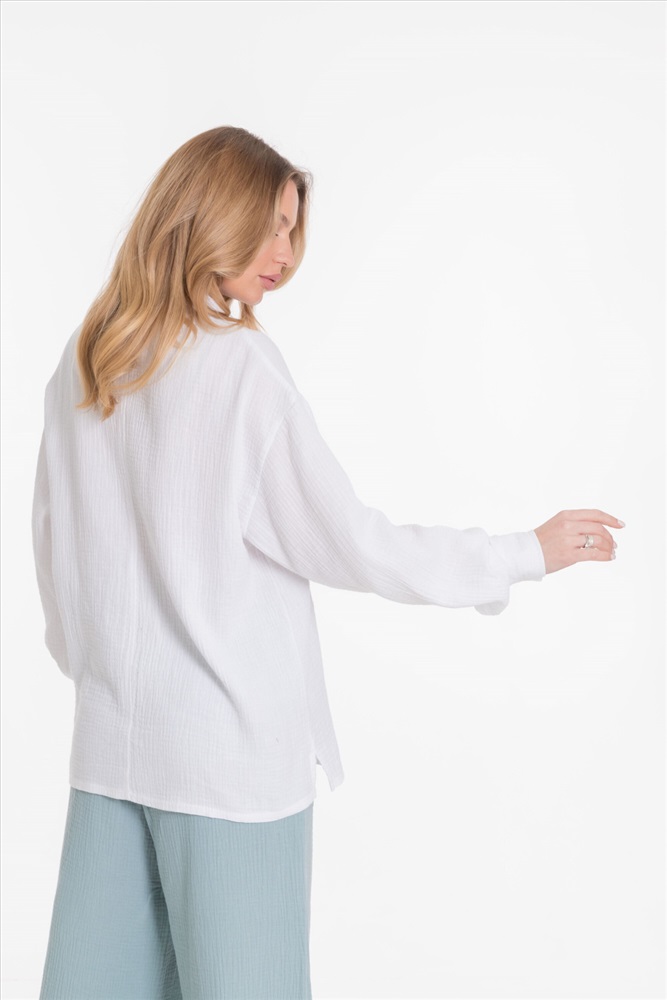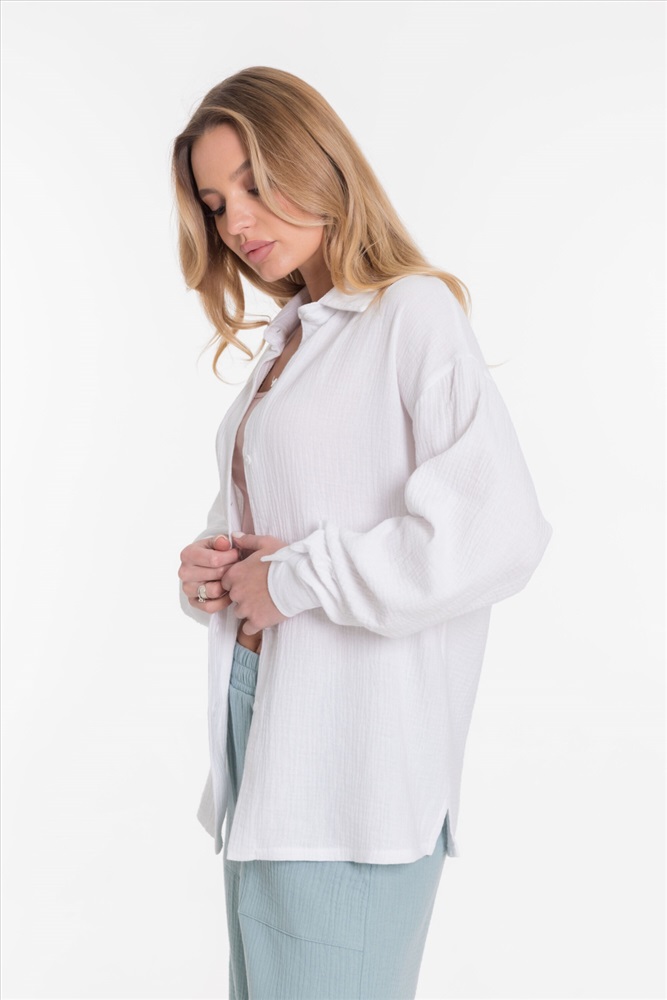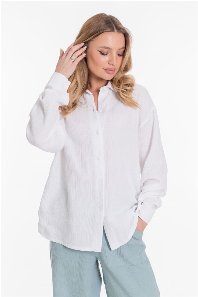 Застежка: Пуговицы С капюшоном: Нет С карманами: Нет Сезон: Всесезонный Силуэт: Oversize Состав: Хлопок 100% Цвет Номенклатуры: белый Женская рубашка — отличный выбор для повседневной носки. Она изготовлена из мягкого, лёгкого натурального материала — муслина. Рубашка имеет длинный спущенный рукав и застёжку на пуговицы. Воротник на отрезной стойке придаёт модели элегантность. В боковых швах есть небольшие разрезы, которые добавляют изюминку в дизайн. Такая однотонная рубашка идеально подойдёт для прогулок, отдыха или неформальных мероприятий. Она выполнена из качественного материала, который хорошо пропускает воздух и обеспечивает хорошую вентиляцию. Комментарии к товару