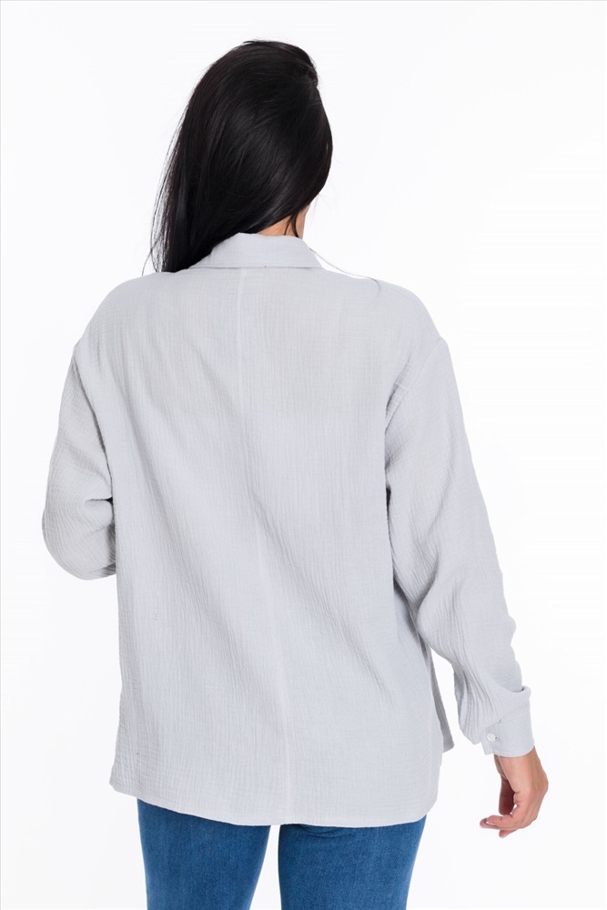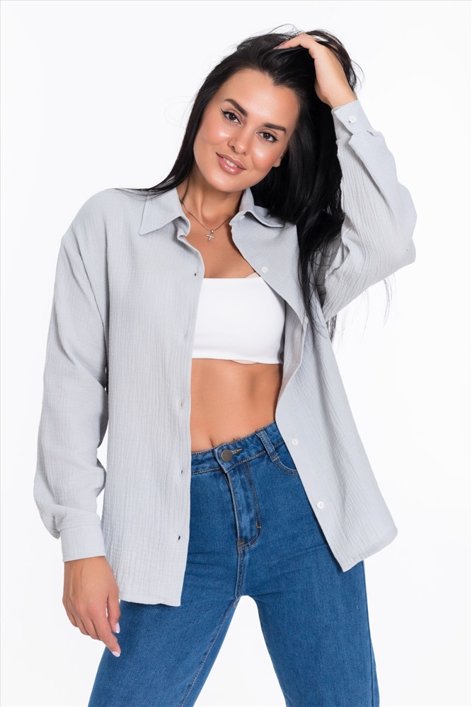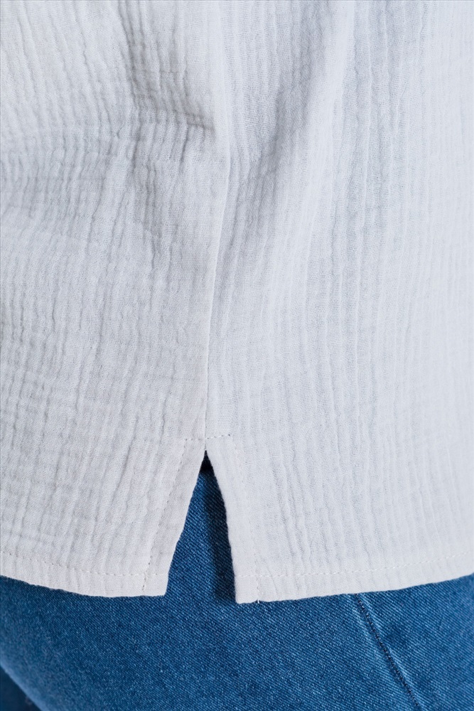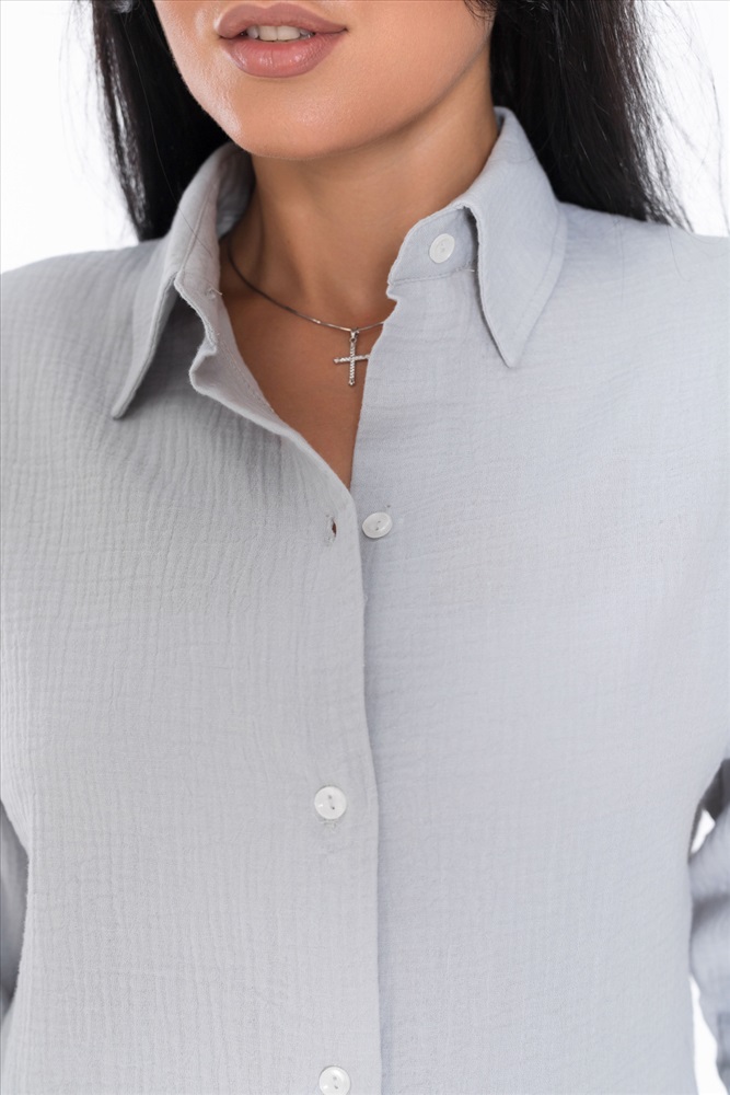 Женская рубашка — отличный выбор для повседневной носки. Она изготовлена из мягкого, лёгкого натурального материала — муслина. Рубашка имеет длинный спущенный рукав и застёжку на пуговицы. Воротник на отрезной стойке придаёт модели элегантность. В боковых швах есть небольшие разрезы, которые добавляют изюминку в дизайн. Такая однотонная рубашка идеально подойдёт для прогулок, отдыха или неформальных мероприятий. Она выполнена из качественного материала, который хорошо пропускает воздух и обеспечивает хорошую вентиляцию.