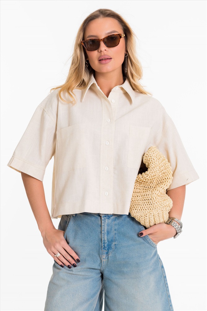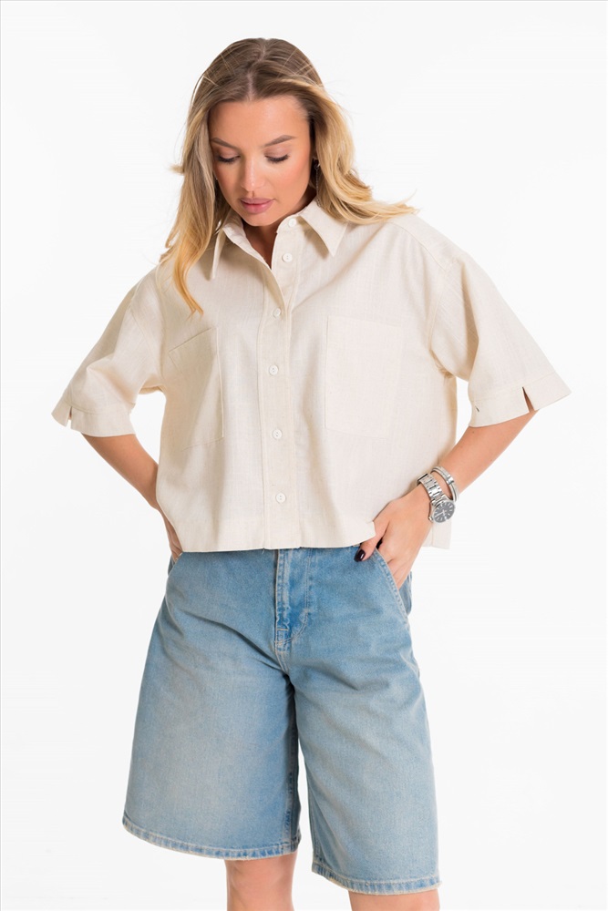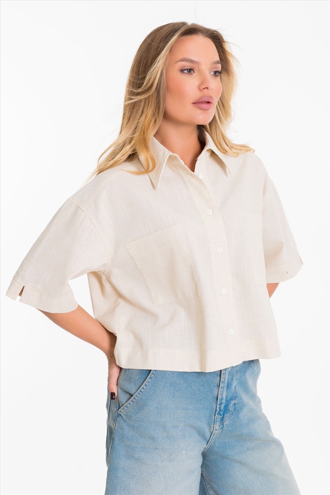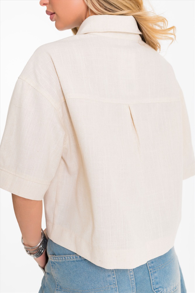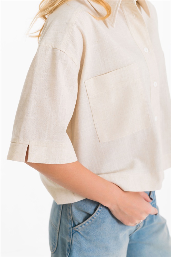 Застежка: Пуговицы С капюшоном: Нет С карманами: Да Сезон: Летний Силуэт: Свободный Состав: Вискоза 80% Лён 18% Спандекс 2% Цвет Номенклатуры: экрю Рубашка выполнена из однотонного натурального льна с вискозой. Рубашка короткая, свободного силуэта с застёжкой на пуговицы спереди. Воротник на отрезной стойке, спереди размещены накладные карманы, рукава короткие с притачной планкой. Комментарии к товару