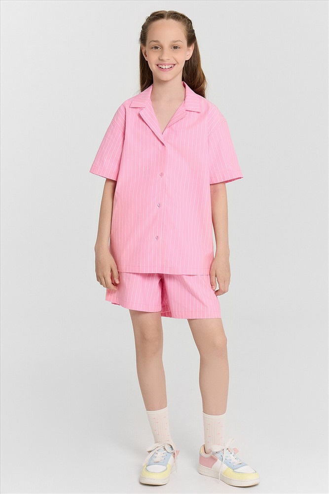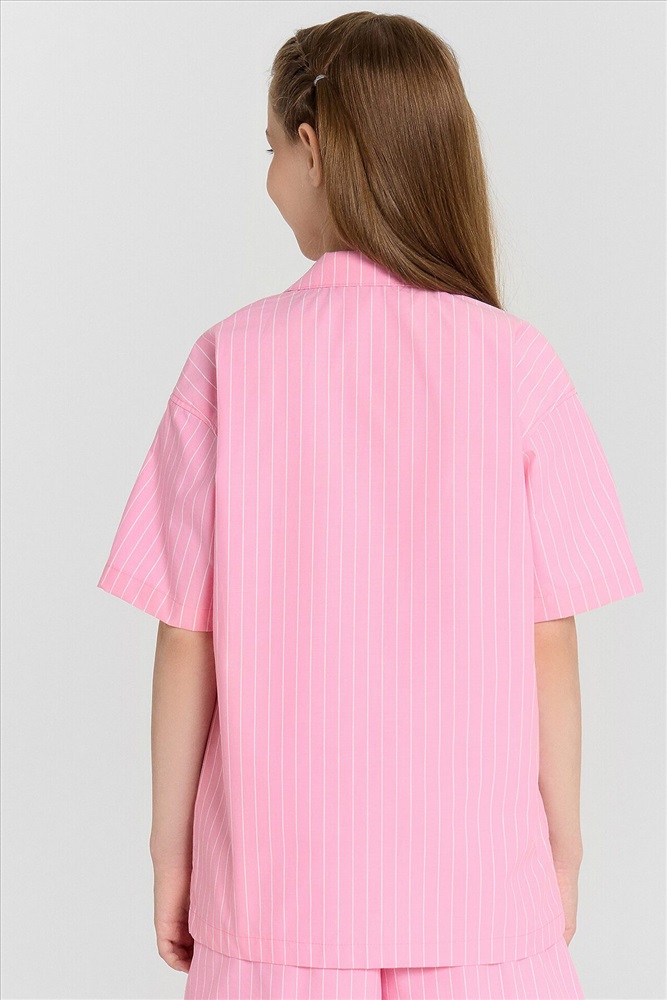 Блузка для девочек. свободного силуэта из ткани. По переду обработана застежка на пуговицы d=10mm и петли. Рукава короткие, втачные, слегка спущены. Нижние срезы изделия и рукавов обработаны швом в подгибку.