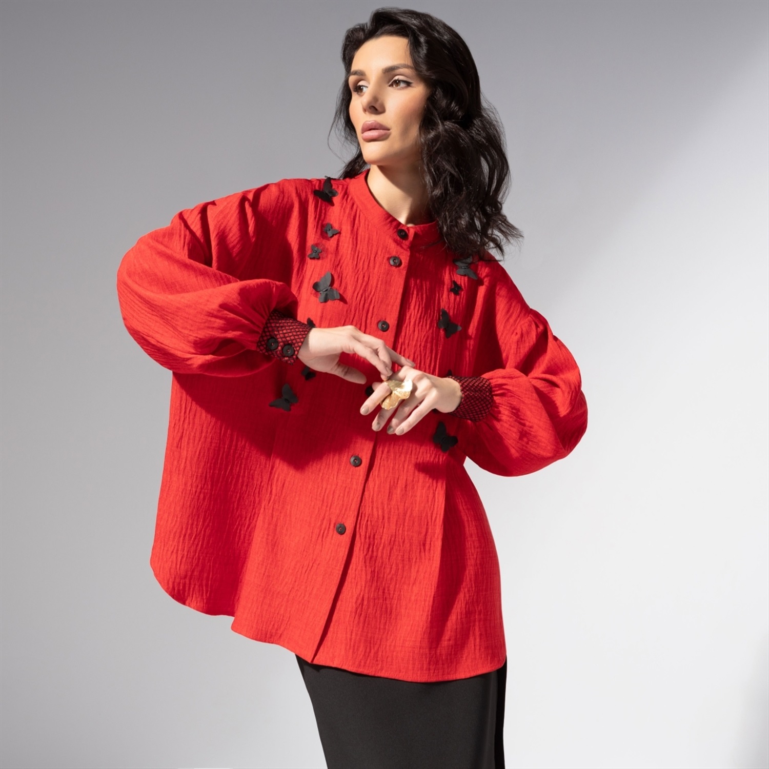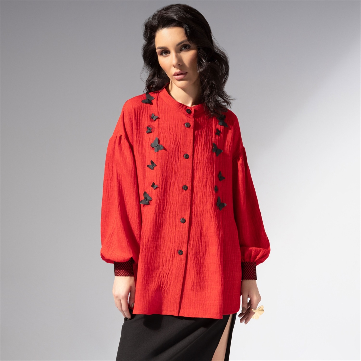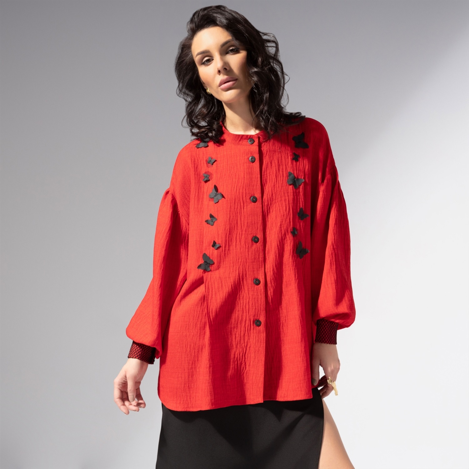 Осторожно – эффект притяжения! Красный оттенок, вдохновлённый коллекциями Paris Fashion Week, превращает рубашку ЧАРУТТИ в арт-объект. Свобода силуэта, мягкий блеск ткани – идеальный баланс между драмой и стилем. Модель выполнена из лёгкой рубашечной ткани «лерис» с декоративной вставкой из сетки на манжетах. Свободный силуэт. Деликатная фактурная ткань устойчива к деформации и выцветанию. Модель дополнена объемным декором.