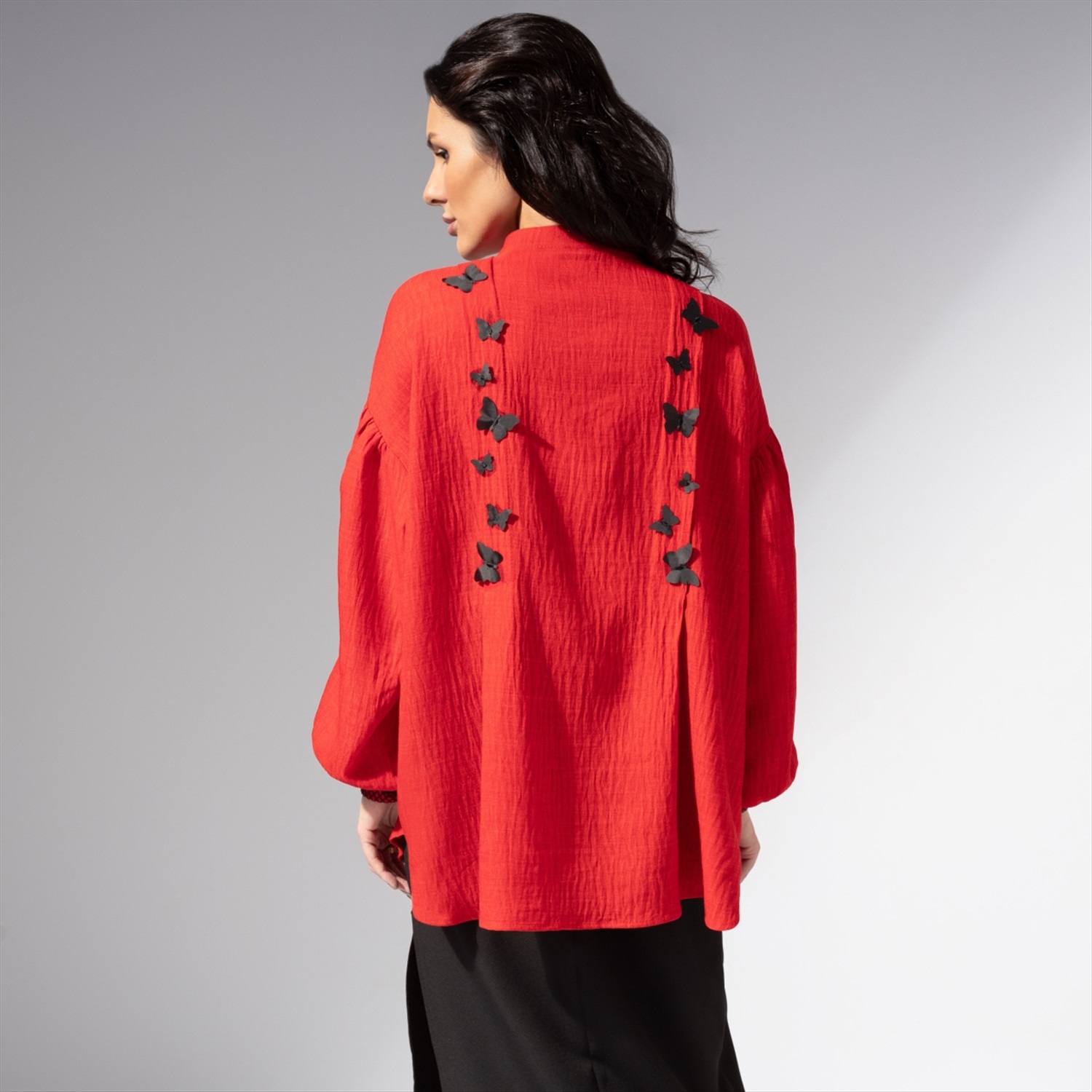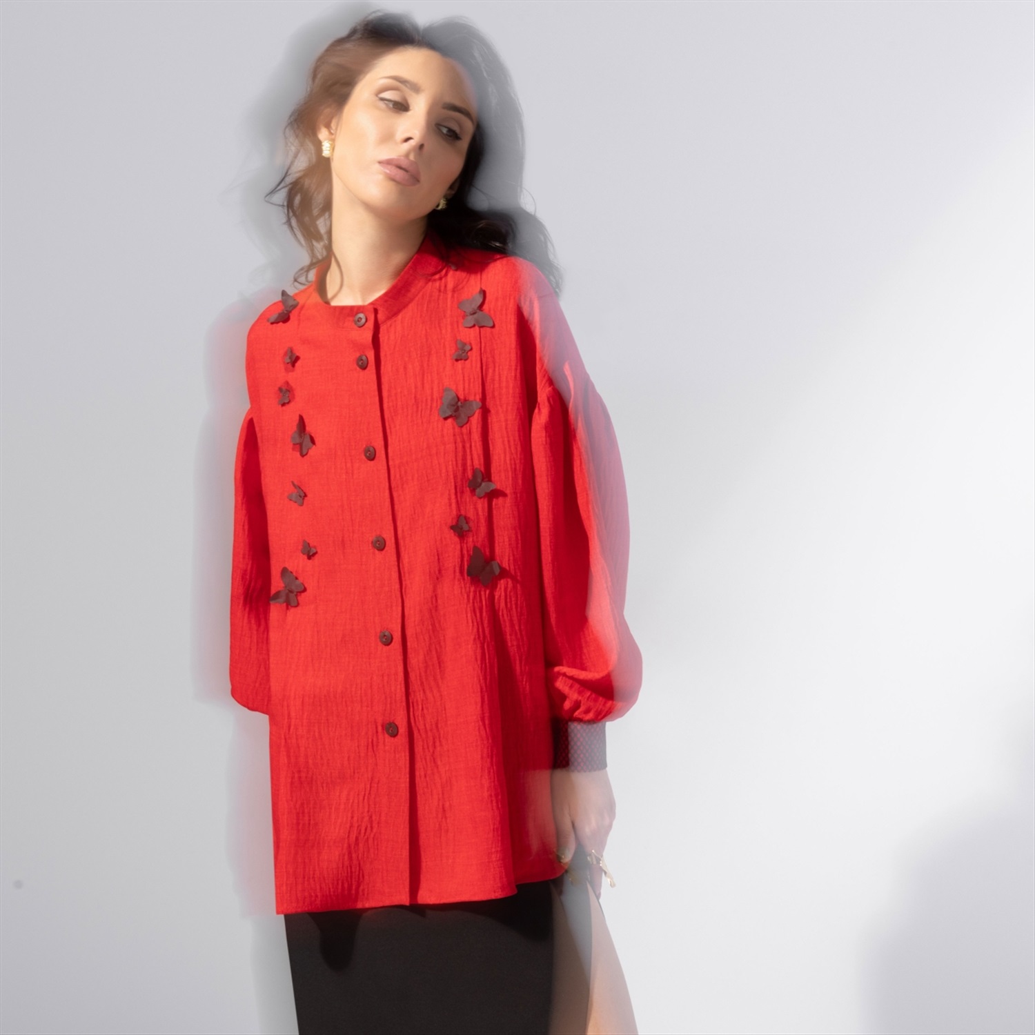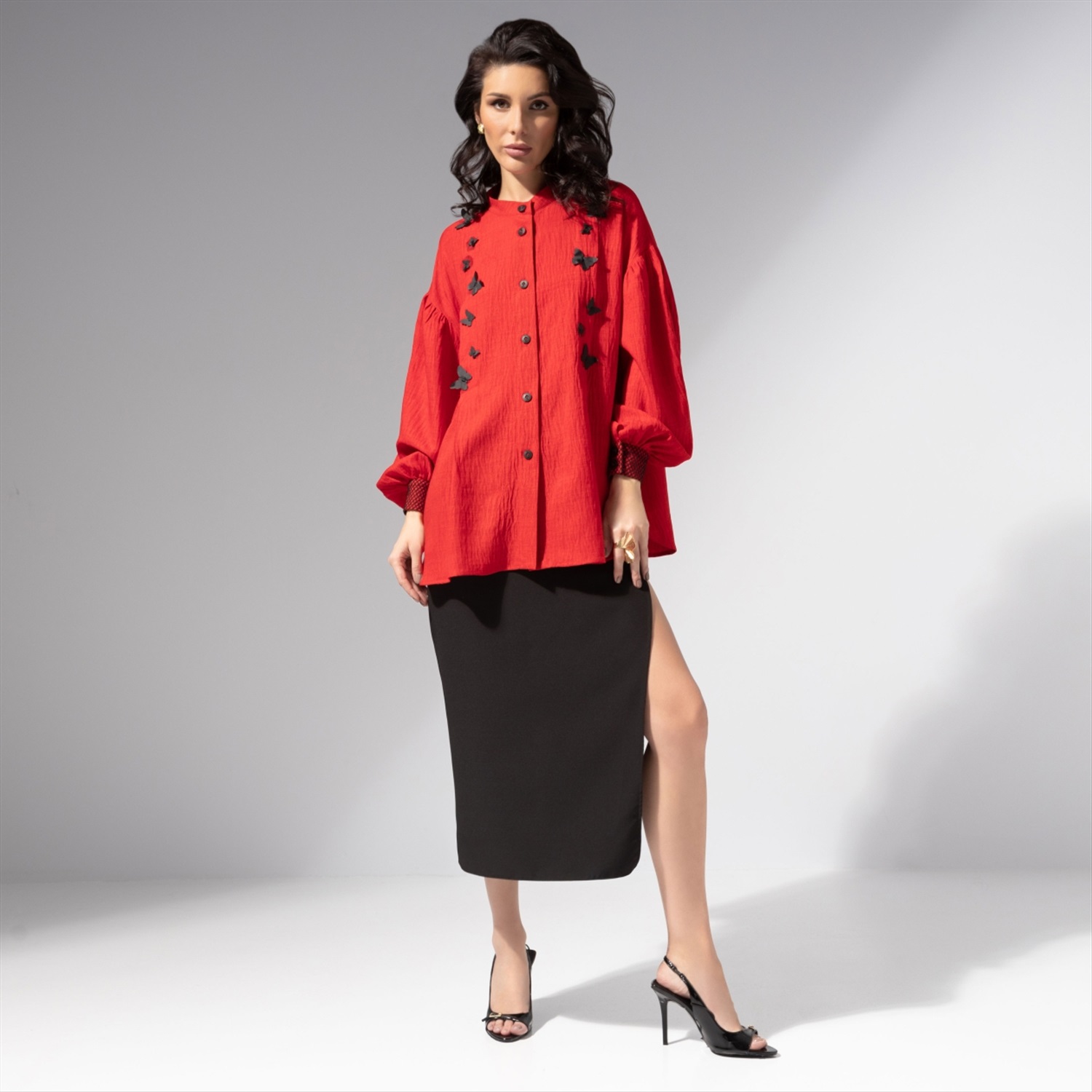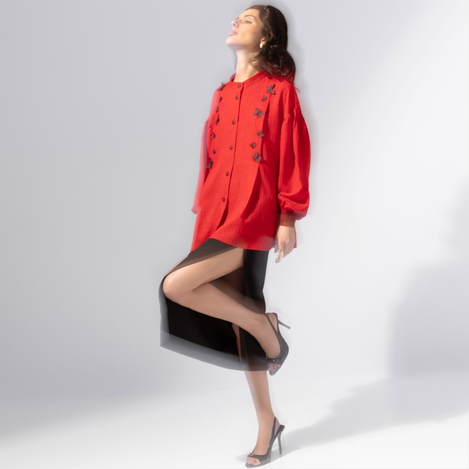 Осторожно – эффект притяжения! Красный оттенок, вдохновлённый коллекциями Paris Fashion Week, превращает рубашку ЧАРУТТИ в арт-объект. Свобода силуэта, мягкий блеск ткани – идеальный баланс между драмой и стилем. Модель выполнена из лёгкой рубашечной ткани «лерис» с декоративной вставкой из сетки на манжетах. Свободный силуэт. Деликатная фактурная ткань устойчива к деформации и выцветанию. Модель дополнена объемным декором.